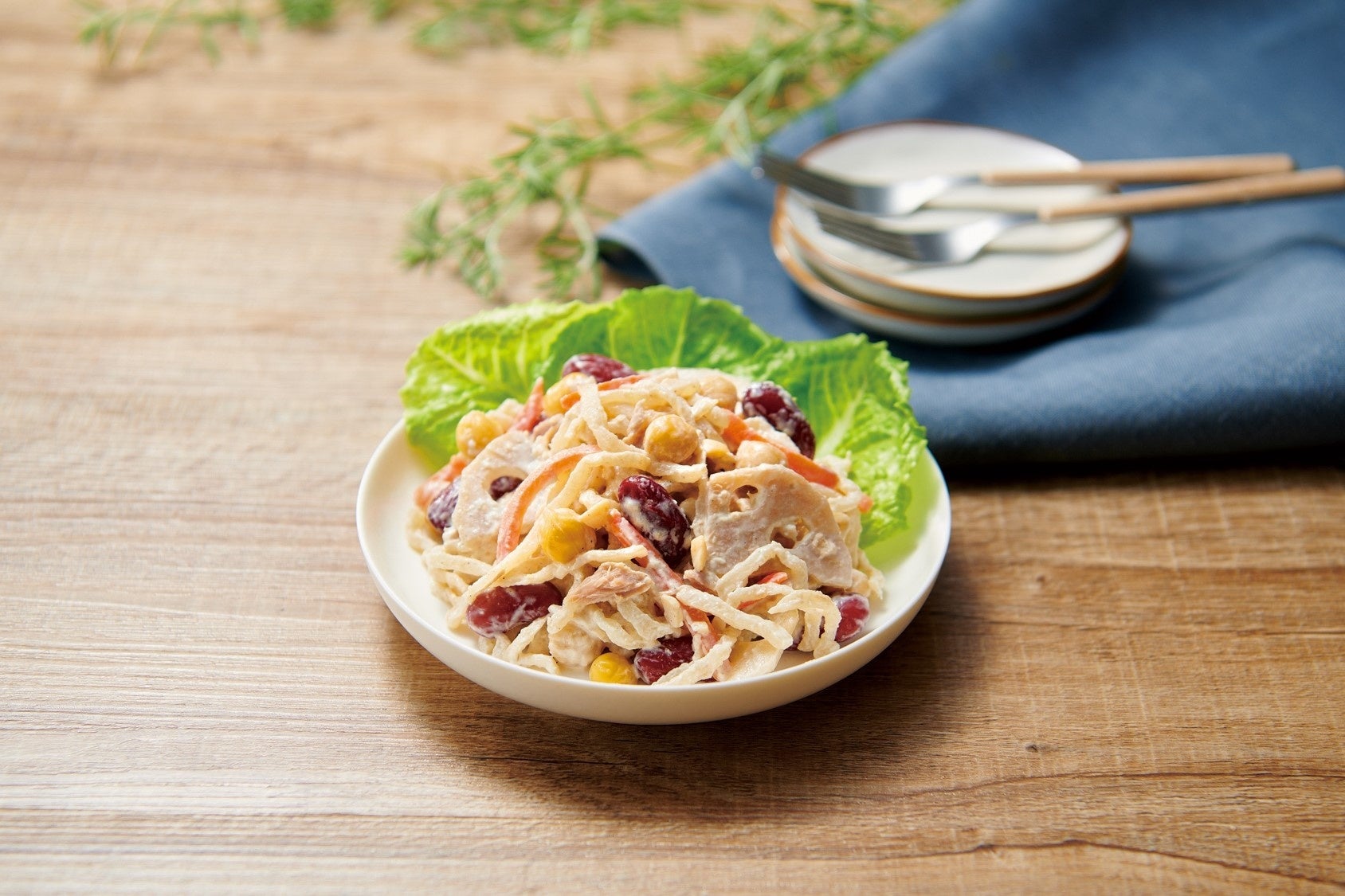 切干大根とツナをメインに、レッドキドニー、ひよこ豆、ひきわり大豆の3種の豆やにんじん、れんこんを使用した食べ応え十分の「おかずサラダ」になっています。