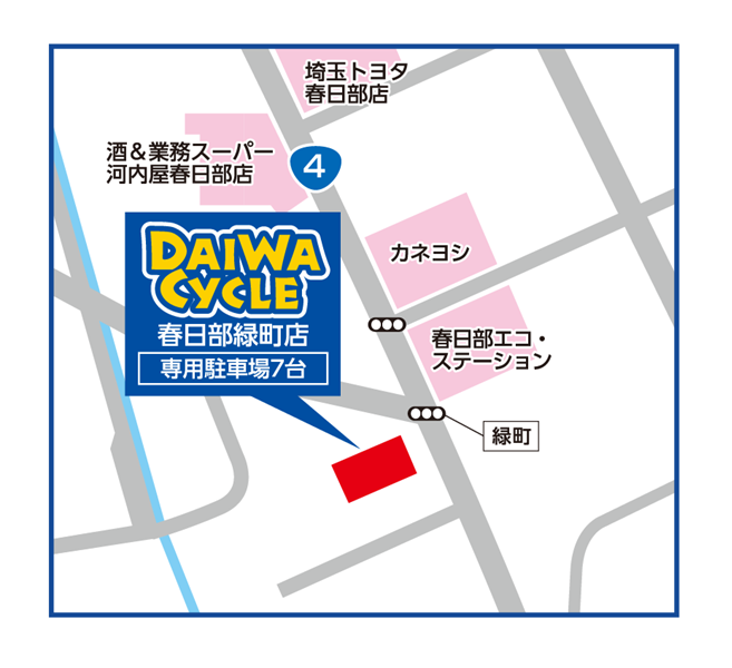 ダイワサイクル春日部緑町店は、国道4号線緑町交差点付近、春日部エコステーション前に位置します。住宅密集地でスーパーも多く、通勤通学途中やお買い物途中に空気入れや、お困りごとなど、気軽にお立ち寄りやすい立地です。7台の専用駐車場を備え、お車でもお越しいただきやすい店舗です。