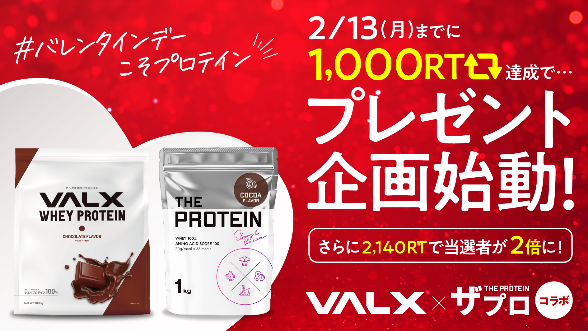 「ザプロ(THE PROTEIN)」を展開する武内製薬株式会社(本社:東京都品川区西五反田 代表取締役:金光 左儒)は、バレンタインにちなみ、2月9日(木)8:00〜13日(月)23:59までの5日間、フィットネスブランド「VALX」を展開する株式会社レバレッジ(本社:東京都渋谷区南平台町 代表取締役:只石 昌幸)とオリジナルグッズが当たるプレゼント企画「2,140RT目指そうキャンペーン」を開催いたします。