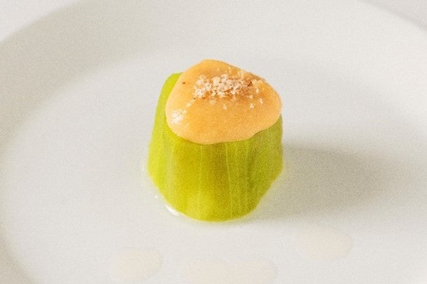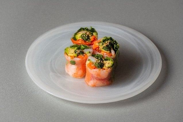 海老と4種の野菜を生春巻きにごまの実オイルを使ったジェノベーゼソースと純正ごま油を合わせた、幾層にもわたる香りの変化を感じられる一品。