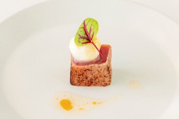 スパイスの香りをまとった鮪の炙りと一口モッツァレラチーズを掛け合わせ、香ばしいMILDごま油と山葵のソースをかけて仕上げました。