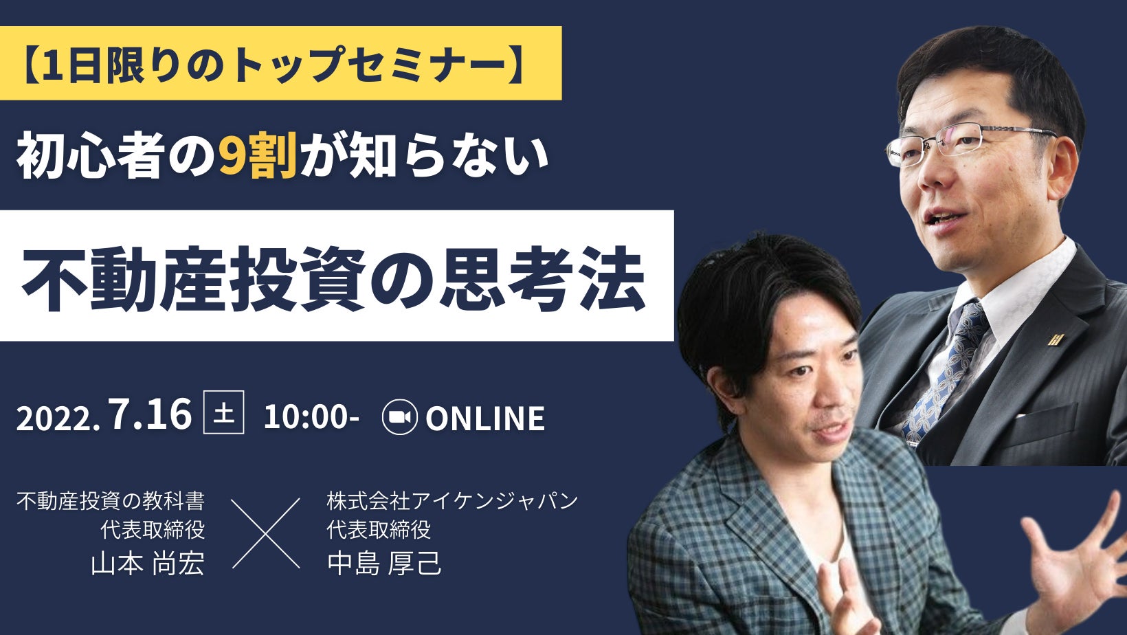 株式会社WonderSpace(本社:東京都港区、代表取締役:山本 尚宏)と株式会社アイケンジャパン(東京本社:東京都港区、代表取締役:中島 厚己)は、2022年7月16日(土)10時から不動産投資の教科書認定の共催セミナーを開催いたします。