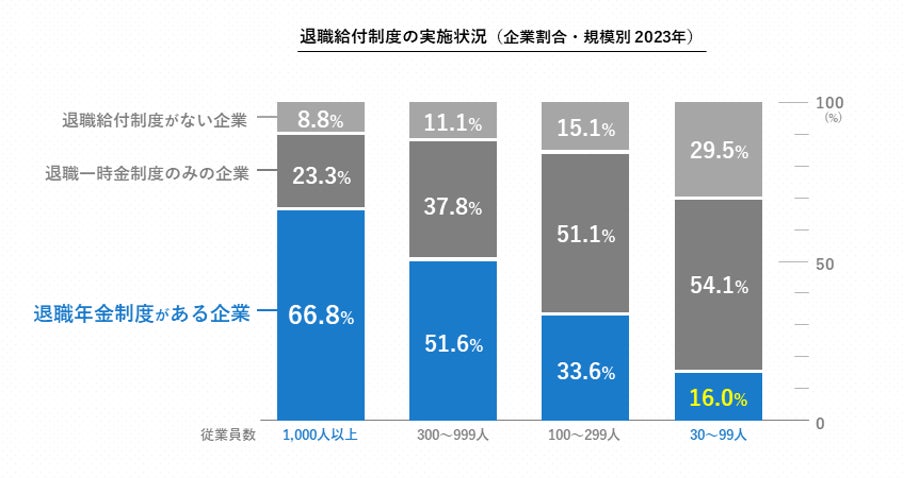 日本の全企業数のうち、中小企業数は99.7%、中小企業で働く従業員数は69.7%*⁴と非常に多い中、100名未満の従業員規模の企業で退職年金制度がある会社はわずか16%*⁵にとどまっています。