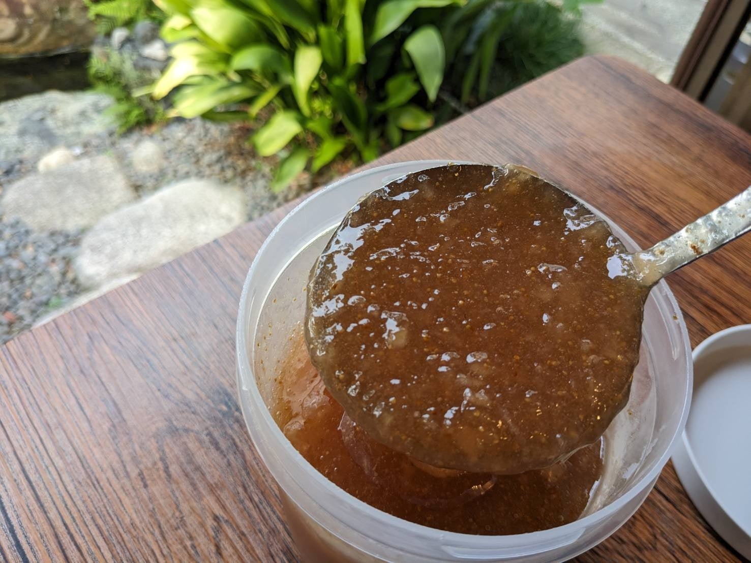 地元で採れた3種のフルーツ(いちご、いちじく、ブルーベリー)の果肉たっぷり濃厚な自家製の蜜になります。フルーツと砂糖のみで保存料、添加物は使用していません。