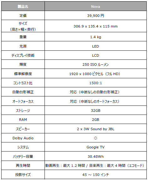 「Nova」は、大画面エンターテインメントとライフスタイルに寄り添う機能を融合させた、新しいプロジェクターです。