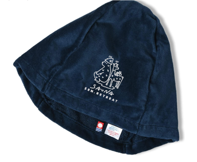 今治タオルを使用したやさしい肌ざわりのサウナハットをプレゼント。森の動物がサウナで汗をかいているかわいらしいイラストも描かれています。