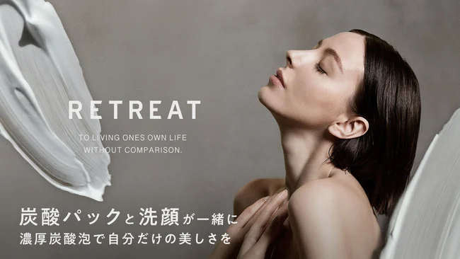 RETREATは仕事やプライベートが忙しい⼈、時短で肌を綺麗にしたい⼈に向けた炭酸泡洗顔です。RETREATは現代では「⼼⾝をリセットして⽇常⽣活を新たに再スタート」する意味合いとして使われています。⼼⾝共に⾃分をゆるめて"より⾃分らしく輝ける" 時間を提供したいという想いから、"RETREAT"と名付けました。