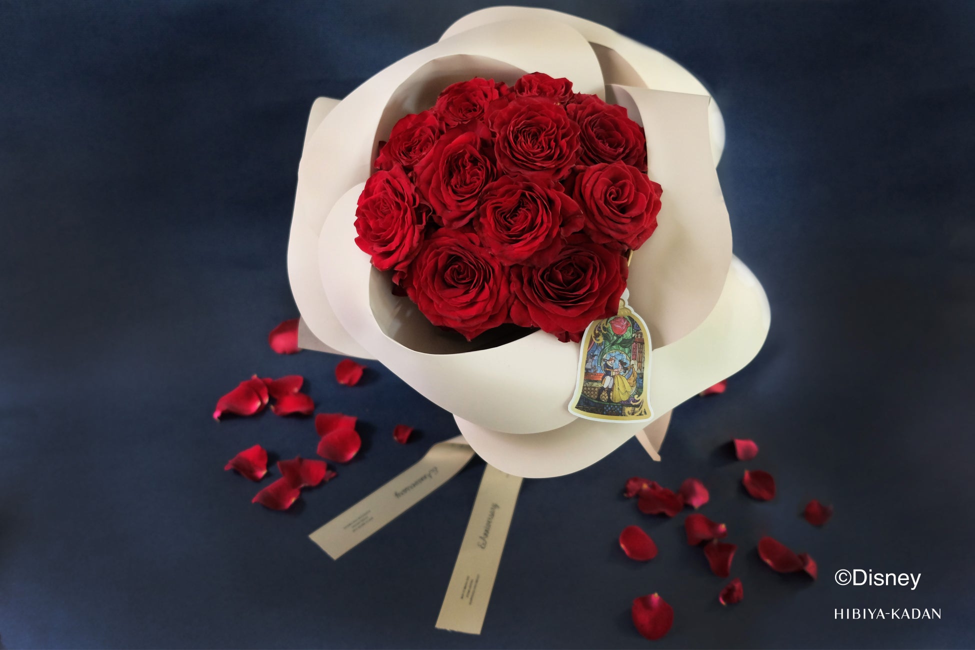 「真実の愛」を象徴する深紅のバラ11本を贅沢に束ね、バラを彷彿とさせるラッピングで仕立てたプレミアムなローズブーケ『ペタルローズ』。美しいステンドグラスアートタグが『美女と野獣』の世界観をより引き立てます。