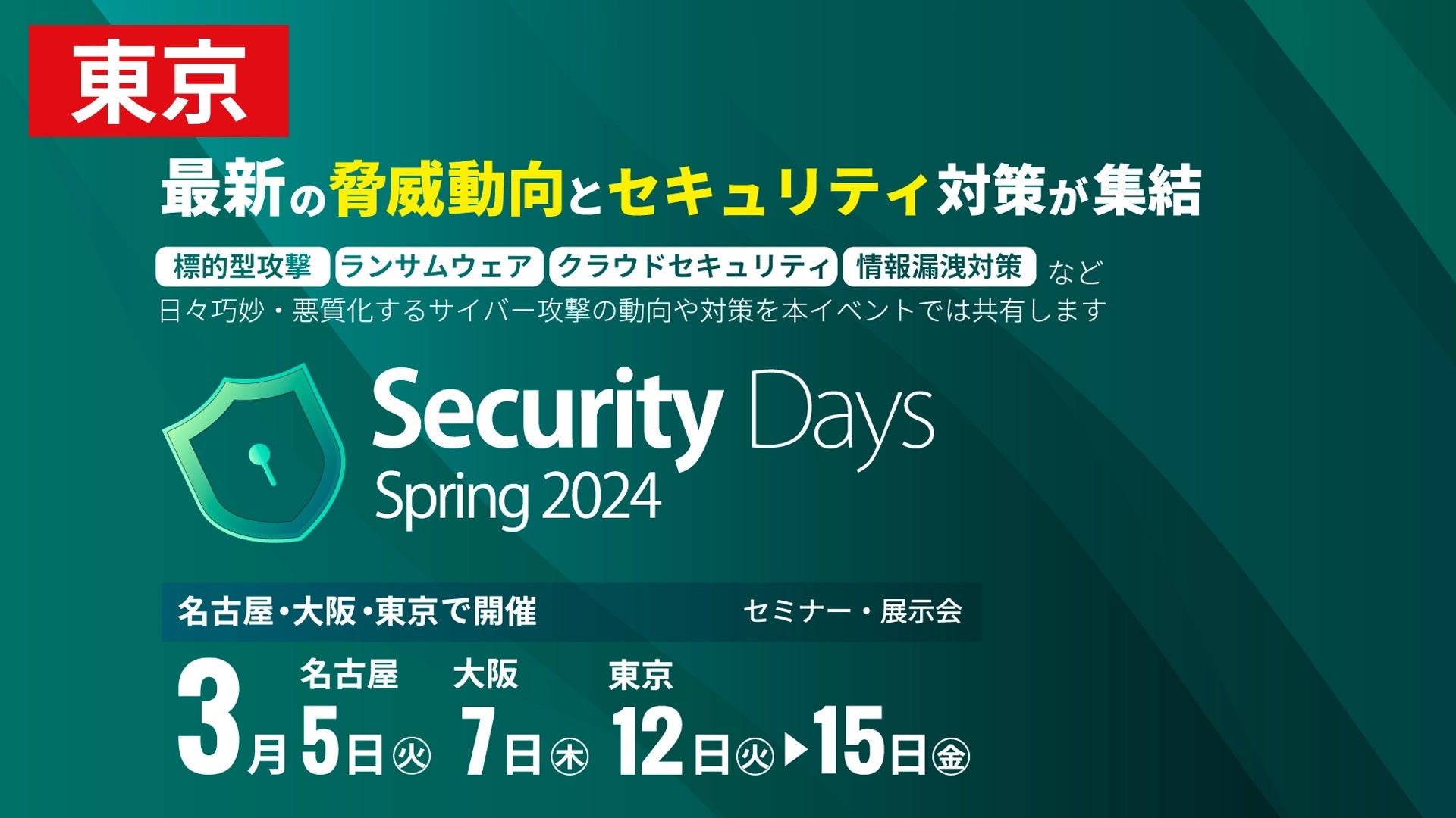 Security Days Spring 2024では、日々巧妙・悪質化するサイバー攻撃の動向や対策、そして変化する環境に対応したセキュリティの考え方についての情報を共有します。標的型攻撃や情報漏洩、ランサムウェアなど各セキュリティテーマから最新事例と対策をお届けします。