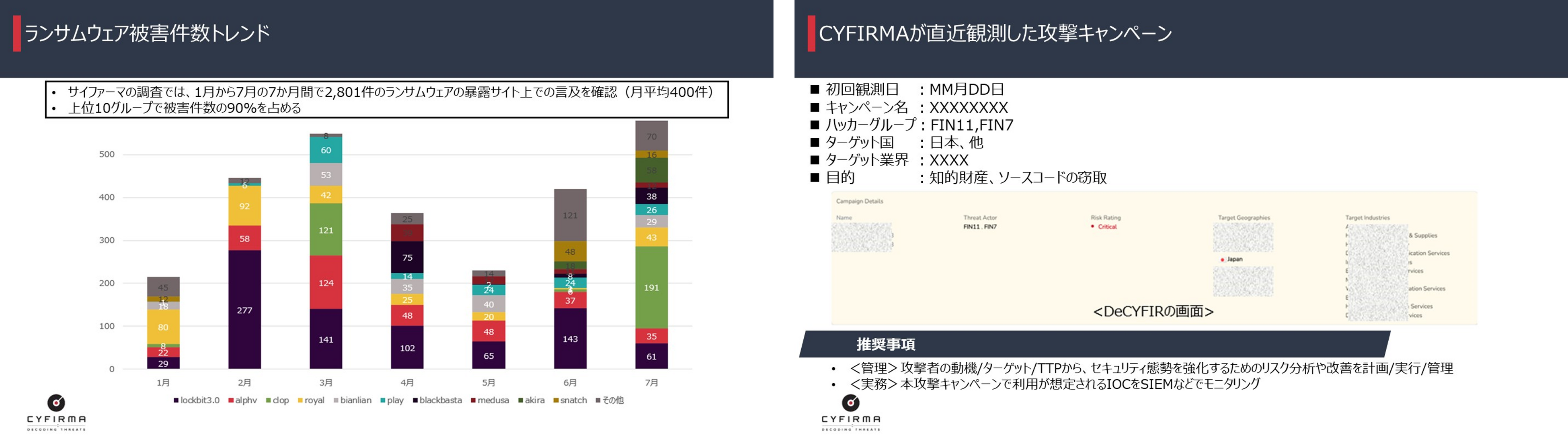 月次定例会を開催し、サイバー脅威の最新動向や、CYFIRMA社が観測した攻撃キャンペーンなどの外部脅威情勢の情報をご提供いたします。