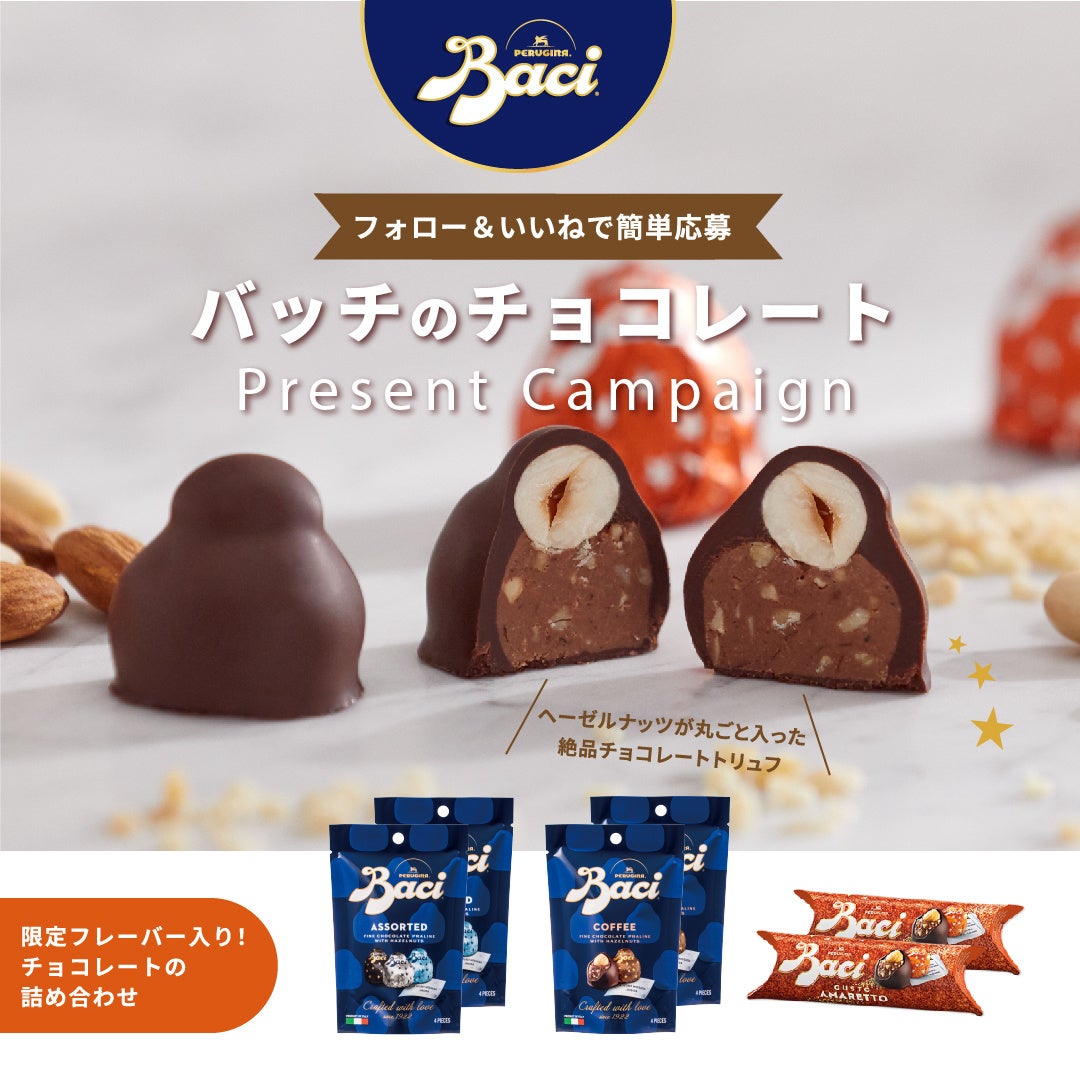 イタリアのチョコレートブランド「Baci(バッチ)」は、この秋パッケージを一新し、新たに4個入りを発売。これを機に2024年10月7日(月) ~ 10月20日(日)の期間中、Instagramキャンペーンを開催いたします。当選者の10名様には、定番の4フレーバーに加えて、昨年大好評だった限定品「アマレットチョコレート」も味わえる特別セットををお届けする予定です。