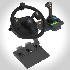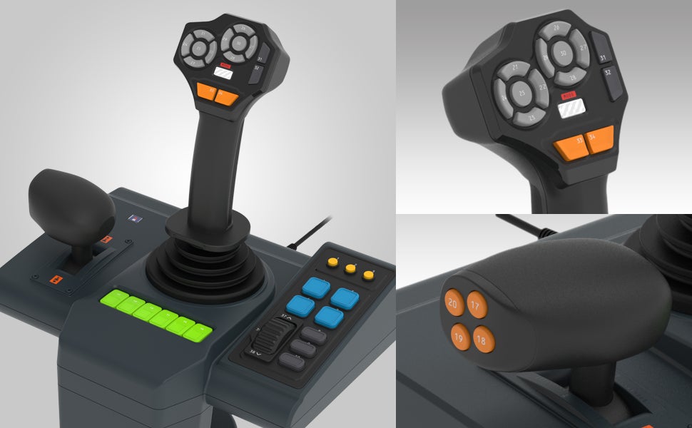パネルユニットにはさまざまな機能が搭載されています。多機能レバーには多ボタン(16ボタン)を配置、レバー部は 前後左右とひねりに対応。これによりクレーンのアーム操作を始め、ゲーム内のさまざまな操作が可能です。また、 スロットルレバーを使用することで、肥料散布やその他の作業中にアクセルペダルを踏まずに一定の速度を維持する ことが可能です。