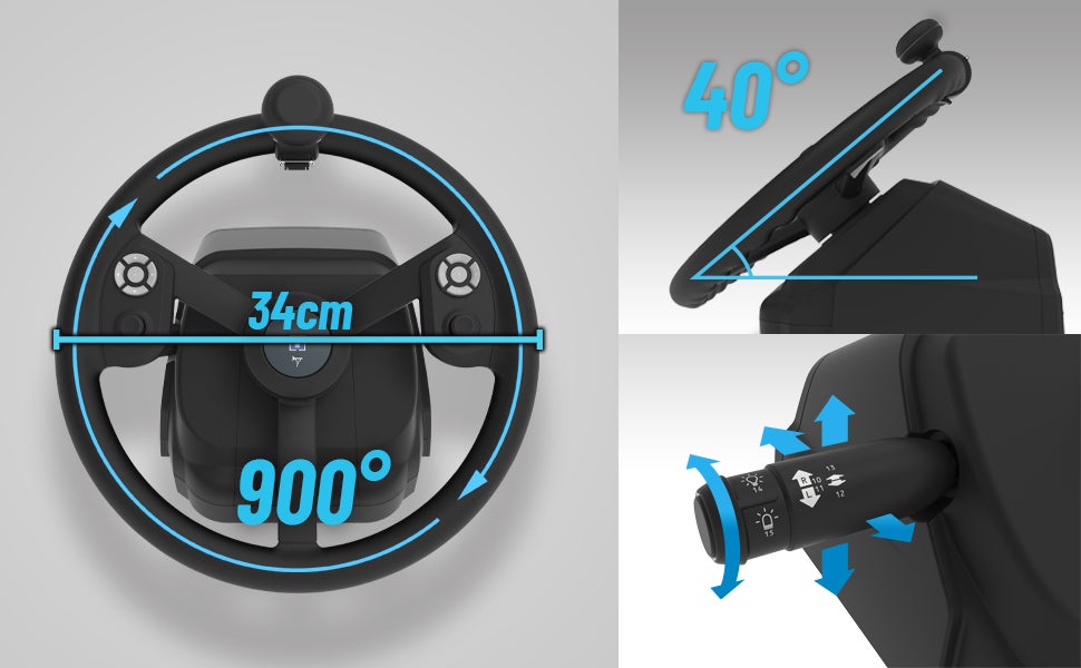 直径約34cmのリアルサイズのステアリングです。グリップは40°の角度に設定され900°回転でき、 リアルなハンドリングを実現しています。 またウィンカーレバーにより、実車と同じ感覚でライトの点灯や運転方向切替が可能です。