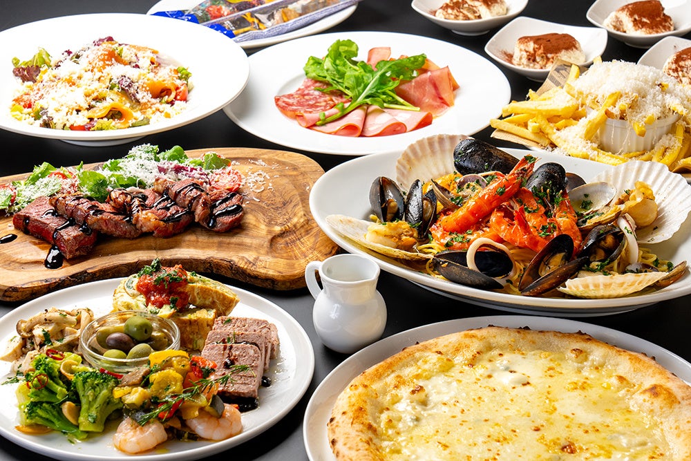 メインのお肉料理『牛ロースのソテー バルサミコソース』のほかにも、濃厚なチーズがたまらない『4種チーズのとろ~りピッツァ』に魚介の旨味たっぷりの『豪華!たっぷり魚介のペスカトーレ・ビアンコ』に
