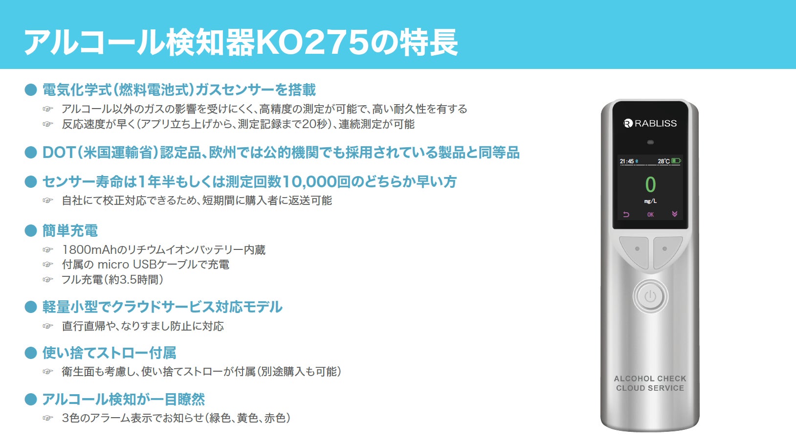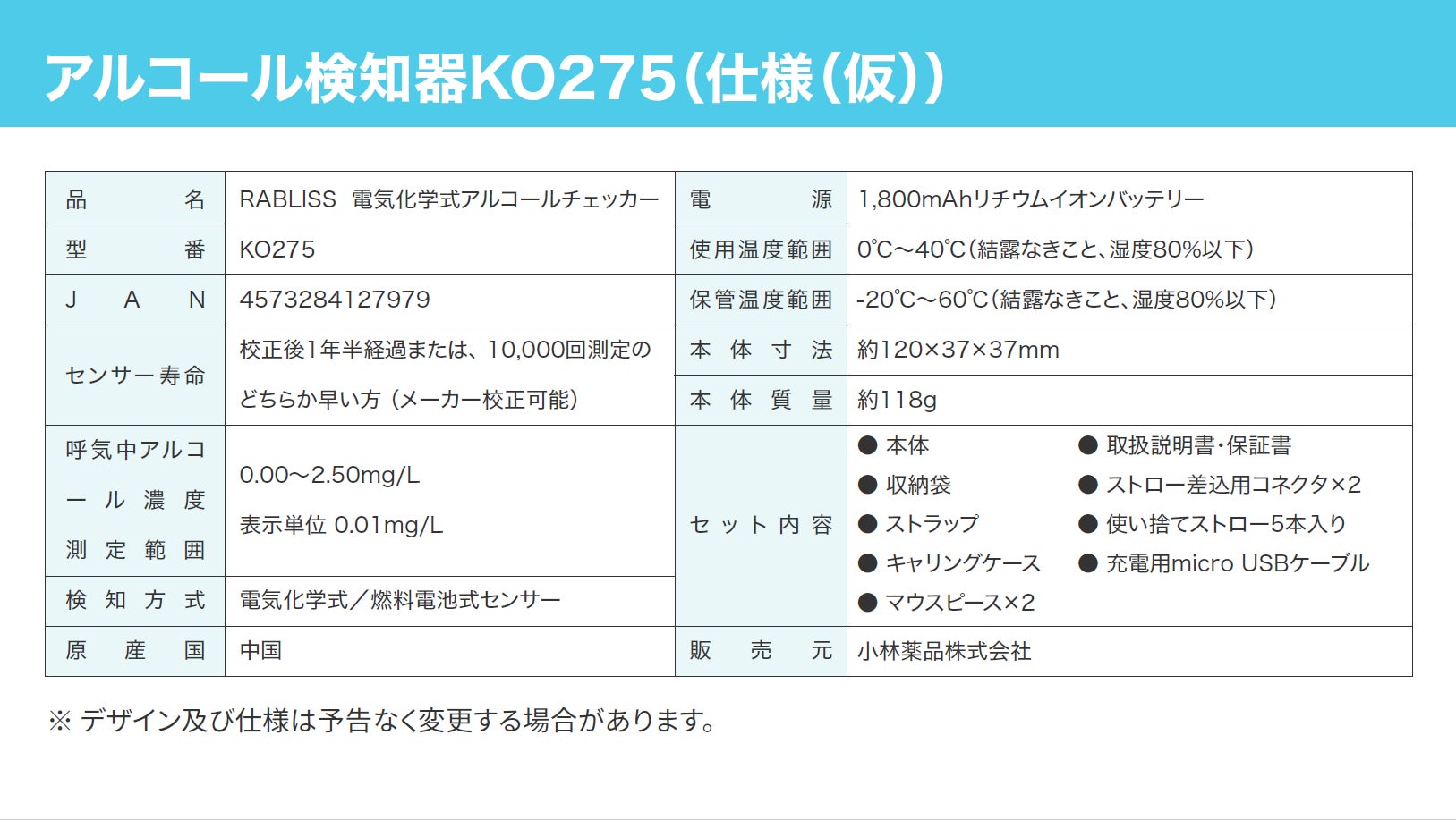 小林薬品株式会社が新たにクラウドサービスを開始します!クラウドサービス対応アルコールチェッカー KO275 9月上旬頃 新発売のお知らせ