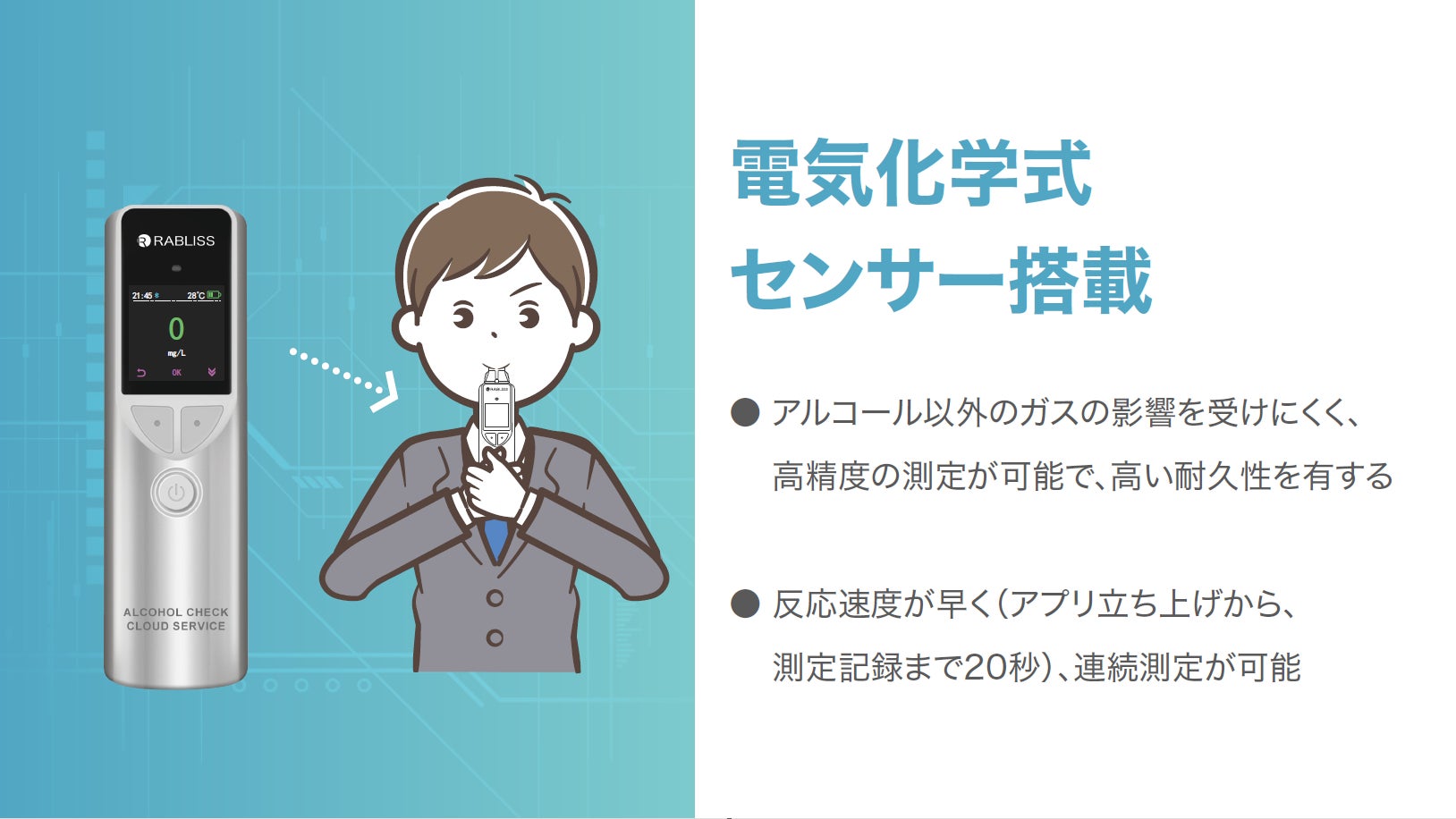 電気化学式センサーで高精度にアルコールを検出!専用アプリと連携し、クラウドでドライバーの検査結果を一括管理! 小林薬品株式会社のクラウドサービスを駆使した、最新機能のアルコールチェッカーです。