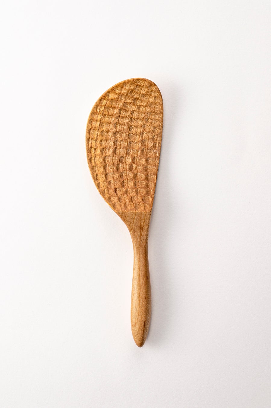 今回発売する「杓文字(しゃもじ)」は、福岡県糸島市の「工房 雲」の木工職人 小野寺 幸裕さんの手によるもの。さっと持ち上げやすく、握りやすい形状が特徴です。ご飯粒がつきにくいよう、すくう面には彫り目をほどこしました。ぜひ日々の食卓に取り入れていただければ幸いです。