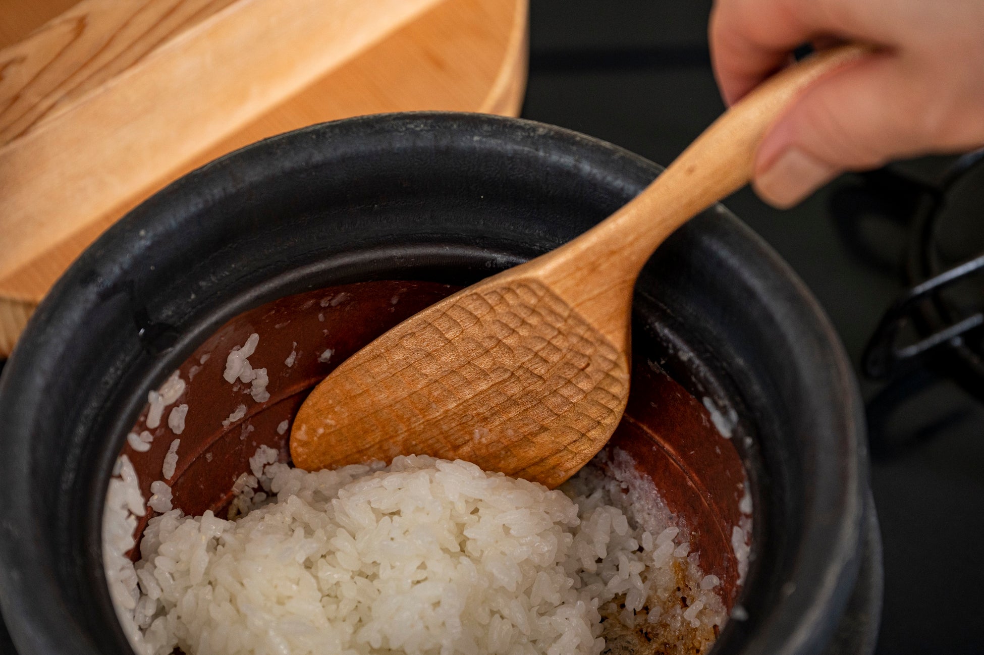 仕入れから仕上げの塗装に至るまで全工程が職人の手作業によるもの。表面の凹凸も、職人が心を込めて手彫りしています。米粒がつきにくく、お手入れがより楽になります。