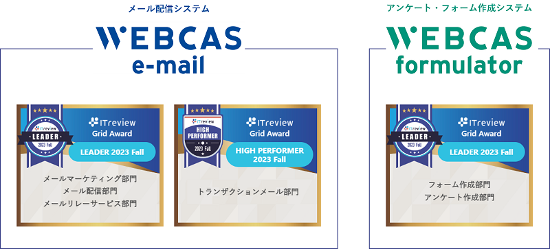 WEBCAS、「ITreview Grid Award 2023 Fall」のメールマーケティング部門やアンケート作成部門などで最高位の「Leader」および「High Performer」を受賞