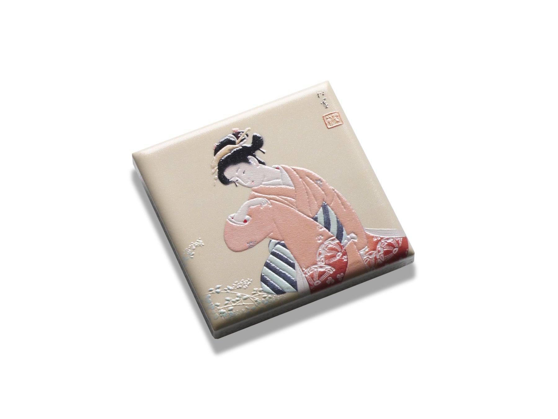 風に揺れる萩に視線を向ける女性を描き、江戸期の装いや髪型によって気品ある美しさを表現した作品です。女性の表情やしぐさの自然な美しさが伝わるように構図を整え、華やかな振袖や帯、繊細な髪飾りの存在感を際立たせるため、細部にまで凹凸を施しました。布の重なりや文様の陰影を立体化することで、晴れやかな装いの豊かさがより感じられる仕上がりとなっています。視線の先に広がる秋の気配を感じられるマグネットです。