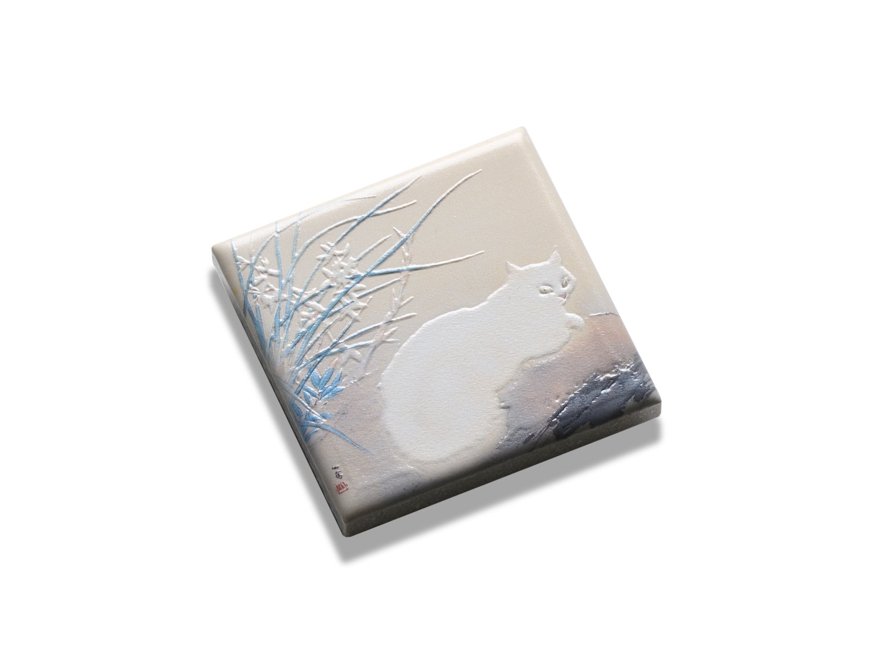 翡翠のような目を見開き、岩上に静かに横たわる美しい白猫が描かれている作品です。やわらかな毛並みを感じる猫のフォルムが引き立つように、墨の濃淡に合わせたグラデーション状のなだらかな起伏をつけて、シルエットが浮かび上がるように仕上げました。印象的な瞳の部分にも細かい凹凸を加えることで、その存在感を強調しています。静寂の中に宿る気高さを感じられるマグネットです。