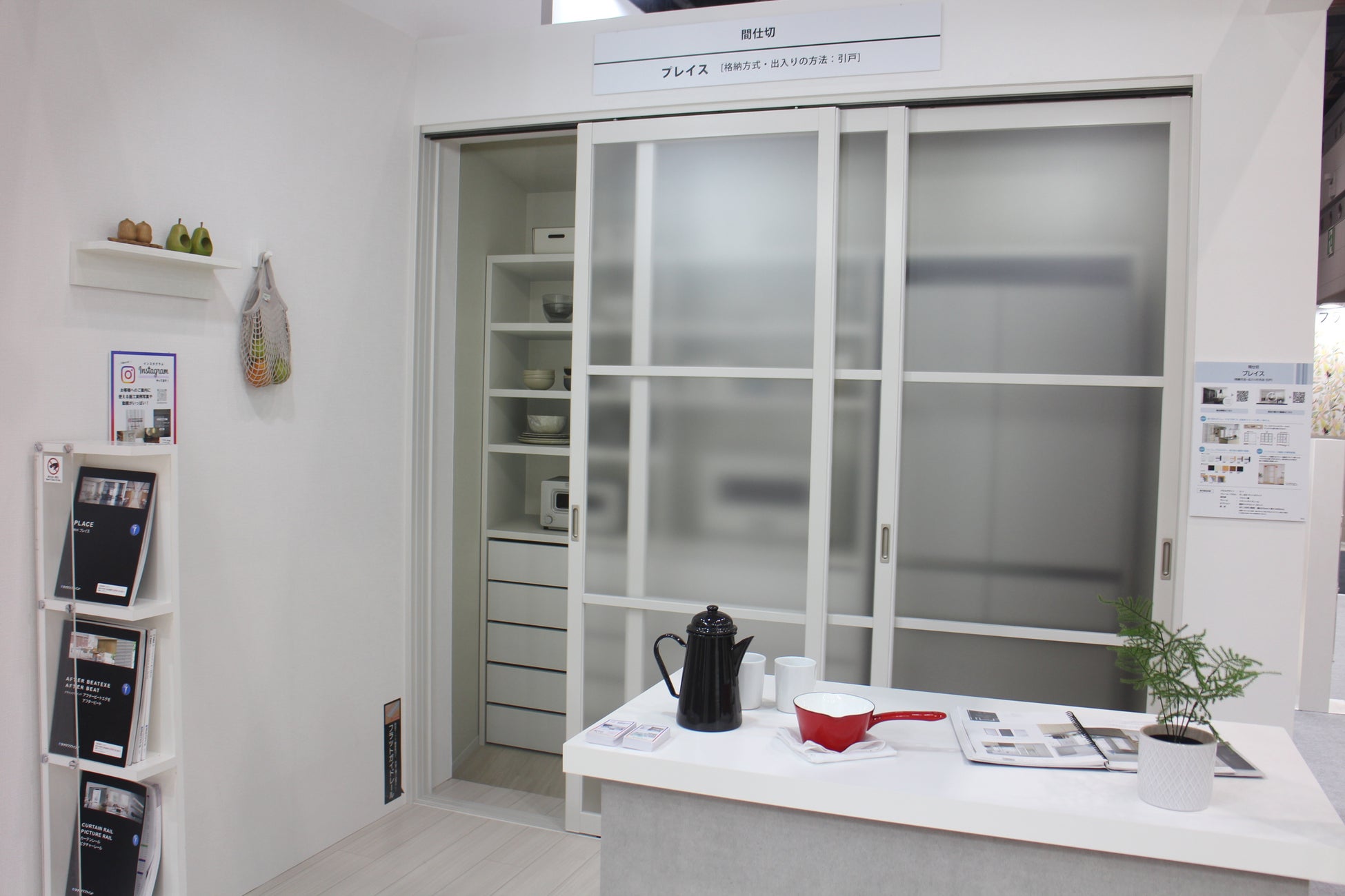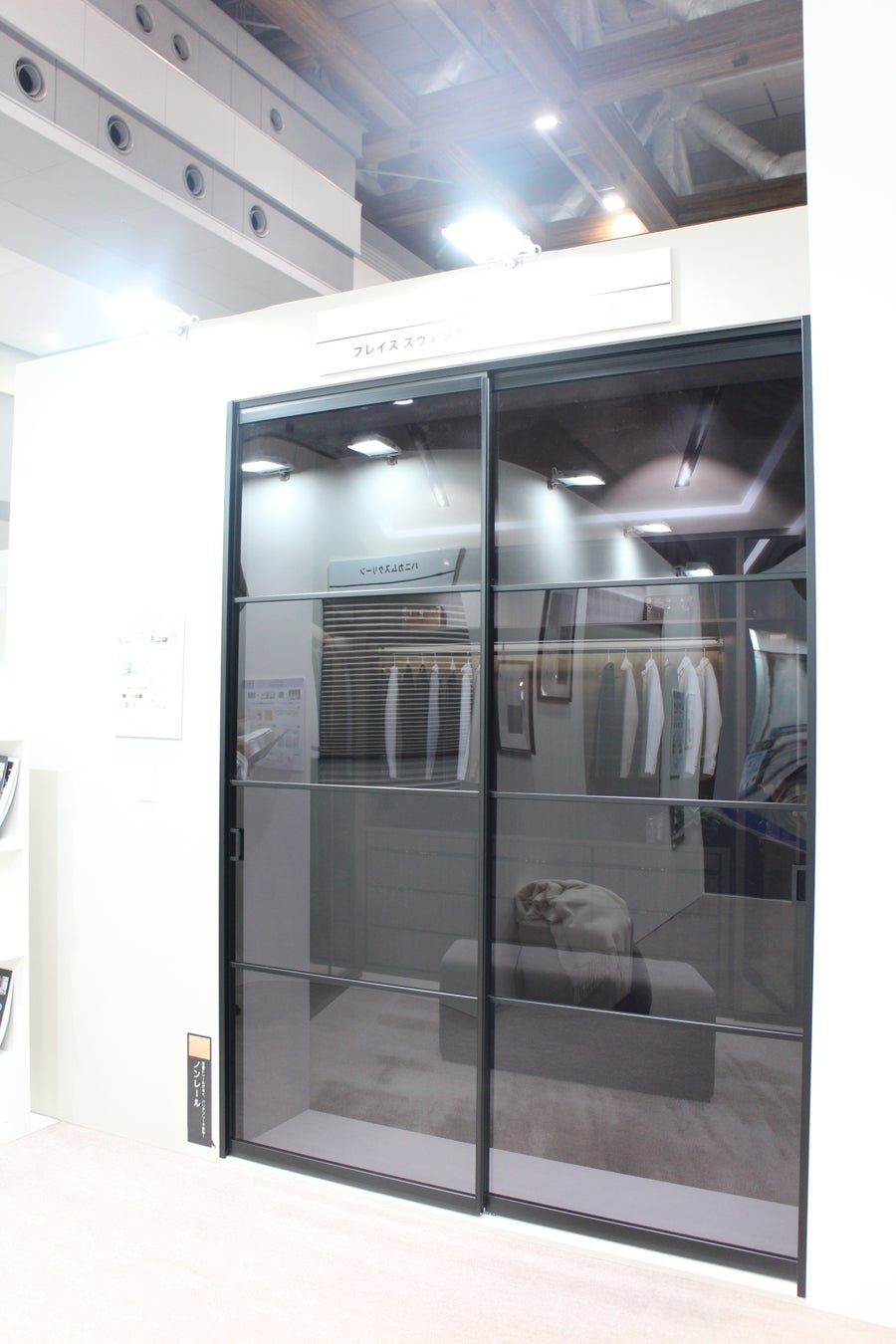また、人気製品の間仕切「プレイス スウィング」を展示し、寝室に設けたウォークインクローゼットへの使用を想定した活用シーンをご提案しました。昨年の発売より注目されている調光タテ型ブラインド「エアレ」は、Ⅼ字型の窓に製品幅6mまで対応できる「レールジョイント仕様」で、「コーナー取付仕様」を展示。レールが2本に分割されることで搬入や施工が便利になる点のご案内に加えて、コーナー部分のすき間を最小限に抑える取付け方で、Ⅼ字型窓の眺望を邪魔せず、美しく納められる仕様をご提案しました。