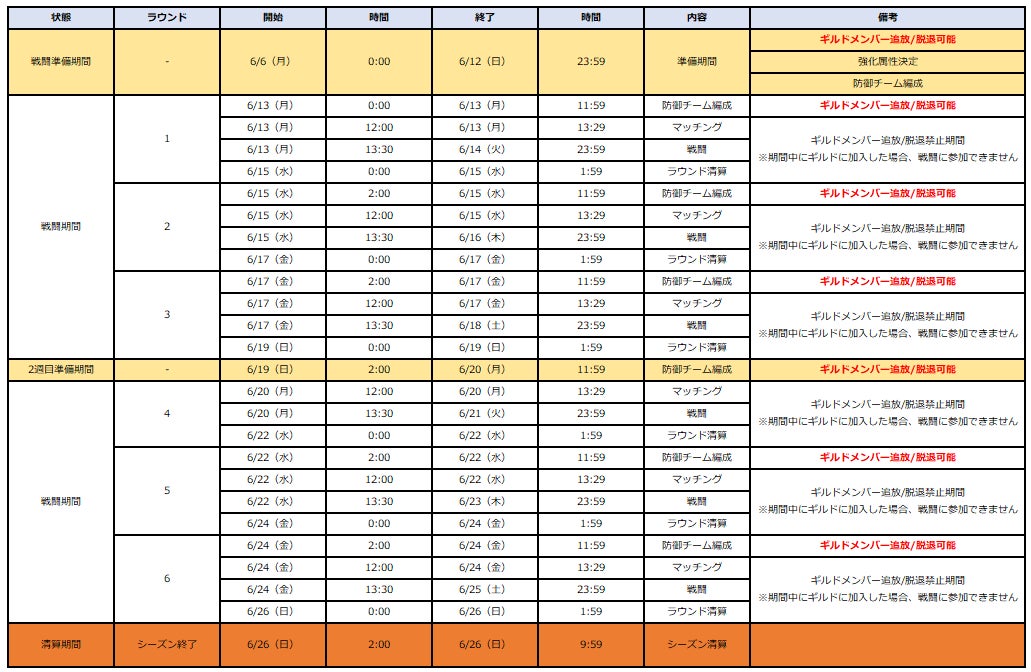 「パルヴァネの戦場」には1週間の準備期間が存在し、防御チームを編成して準備したのち、2週間のギルド競争戦を行います。複数のギルドと対戦し、シーズン中に相手の防御チームを倒し、より多くのスコアを獲得したギルドが勝利となります。準備期間は6月12日(日)23:59までとなりますので、入念な準備を行い、ギルドメンバーで協力してランキング上位を目指しましょう!