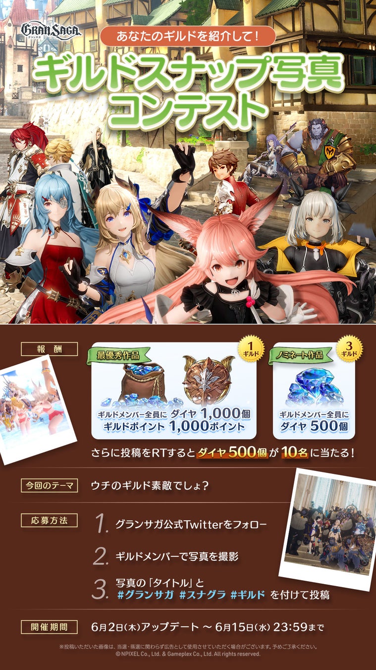 ノミネート作品に選ばれた3つのギルドには、対象ギルドのメンバー全員にダイヤ500個を贈呈。最優秀作品に選ばれたギルドには、ギルドメンバー全員にギルドポイント1,000ポイント&ダイヤ1,000個を贈呈いたします!また、グランサガ公式Twitterのキャンペーンツイートをリツイートすると、抽選で10名様にダイヤ500個をプレゼントいたします!ぜひ、ご参加お願いいたします!