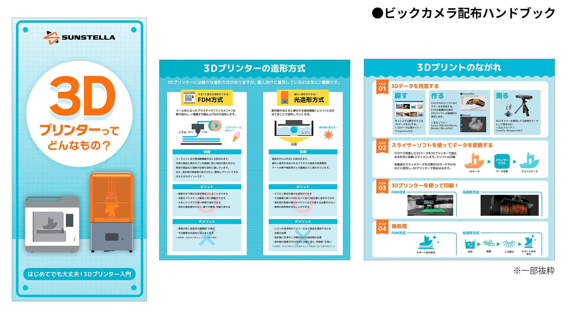 また、使用用途や造形方式、3Dプリントの流れなど、初心者が導入前に躓きやすい部分をまとめたハンドブックを店頭にて配布しております。