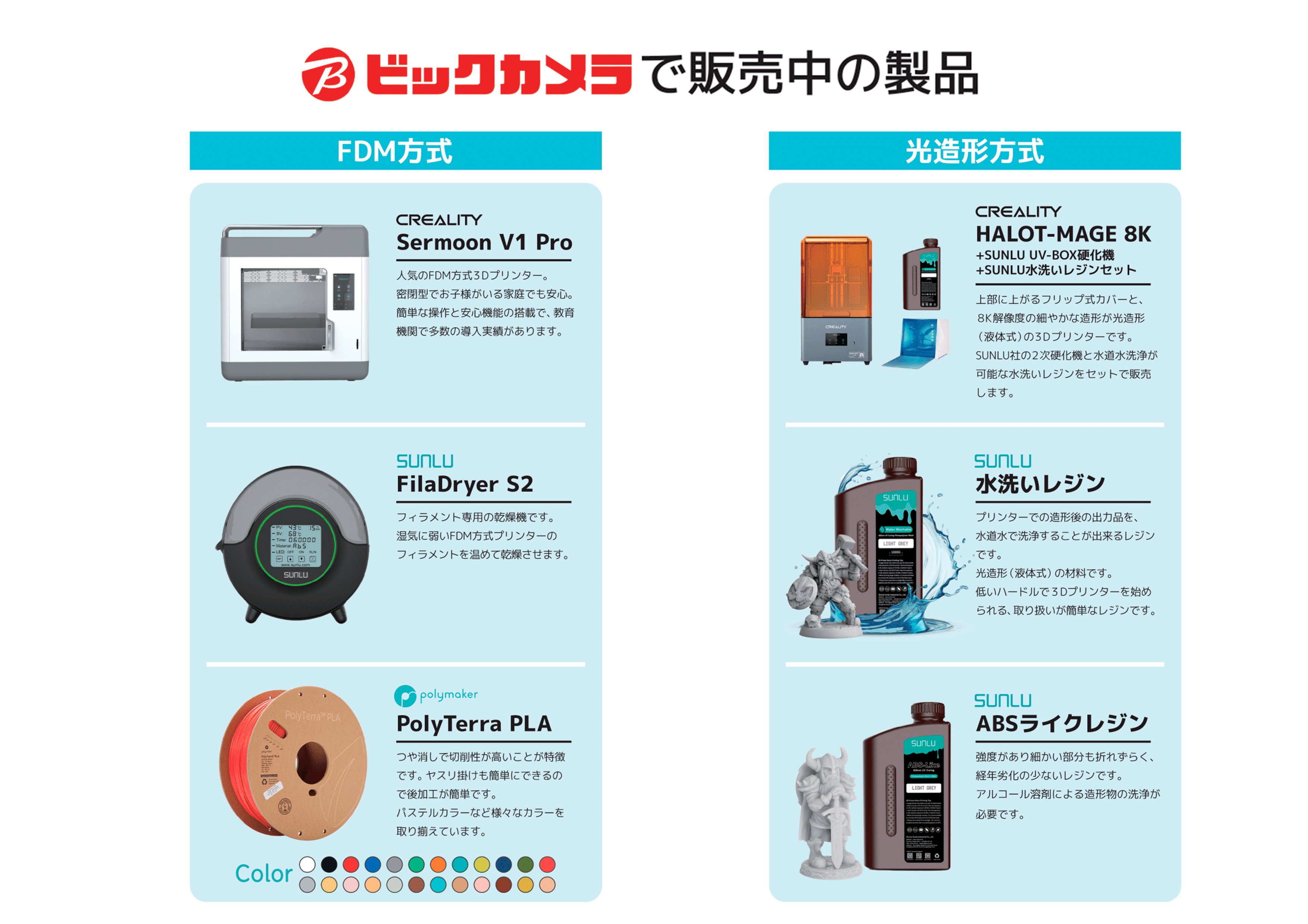 レジンやフィラメント・乾燥機も全国のビックカメラ店舗及びインターネット通販サイト「ビックカメラ・ドットコム」(https://www.biccamera.com)にてご購入いただけます。