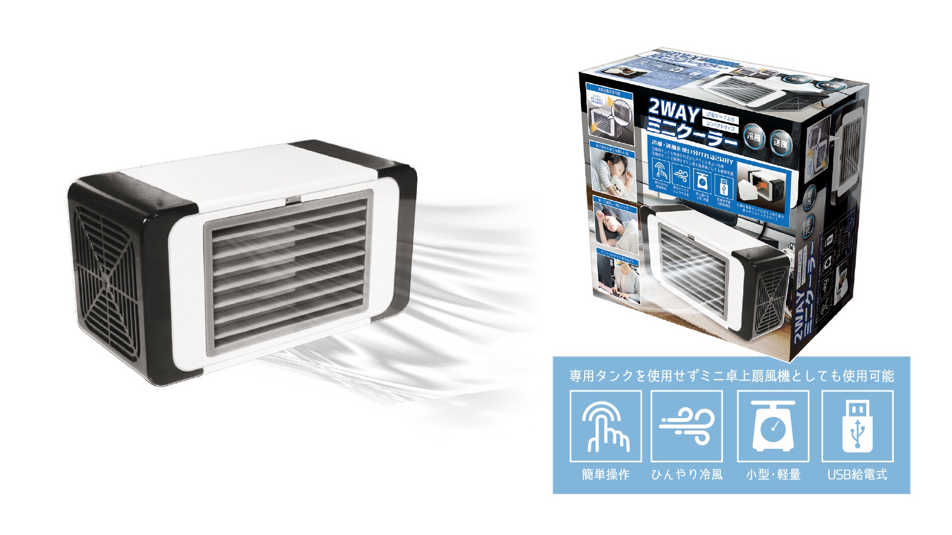 特徴:冷風・送風の2WAY式ミニクーラー。専用タンクを内蔵することで、ひんやり冷たい風を送風できます。送風口を上下させて送風位置の調整も可能。コンパクトサイズで携帯性が抜群、自宅でもオフィスでも使えます。暑くて寝苦しい夏場のシーンも快適に、優しく冷たい風を送風します。