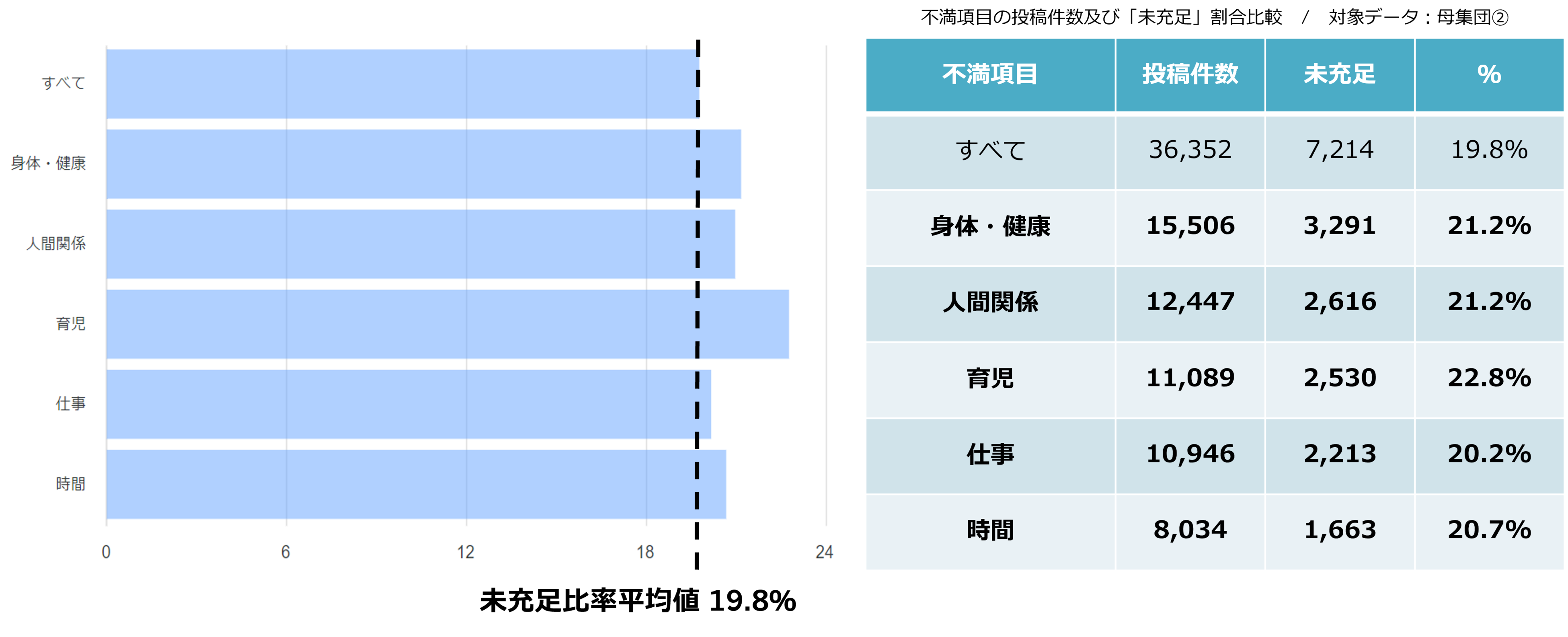 母集団②を対象に、不満項目別の投稿件数と「未充足」割合を比較した。投稿件数は「身体・健康」「人間関係」「育児」が上位となった。「未充足」の割合は、全体平均が19.8%であったのに対し、全ての不満項目でそれを上回った。