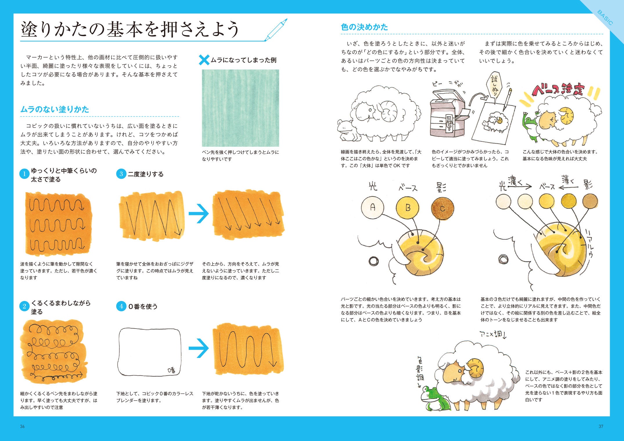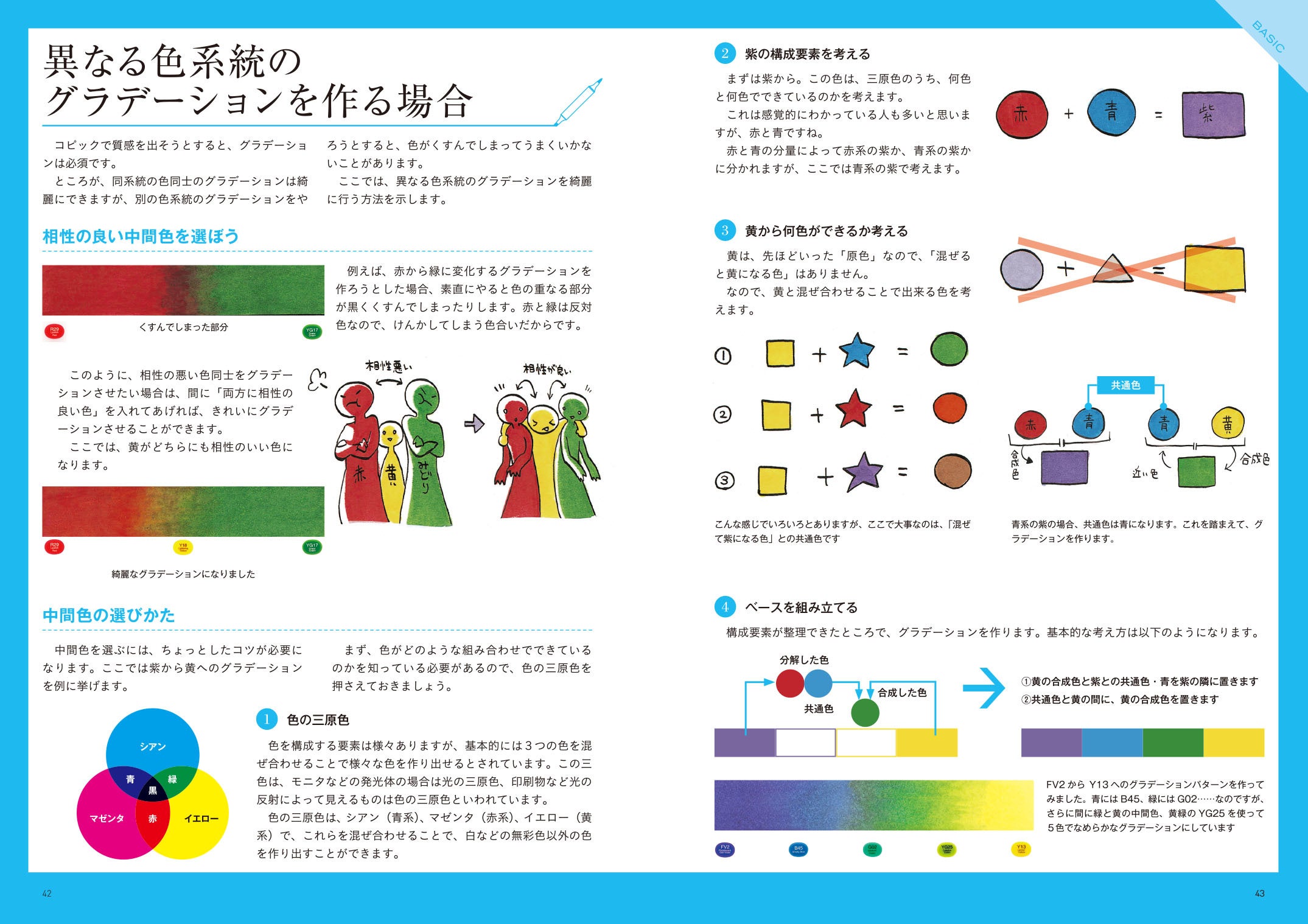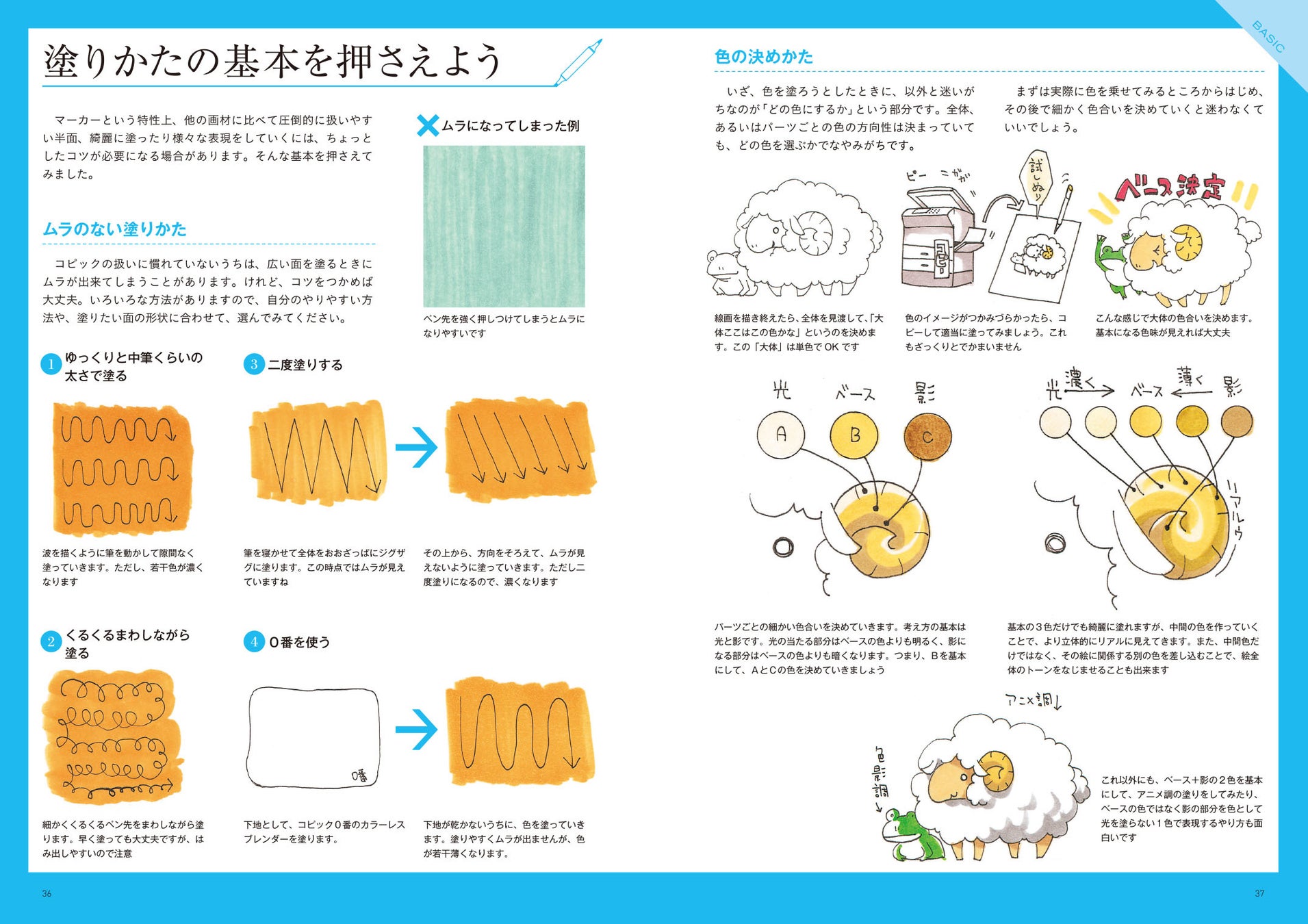 ・Basic Lesson(コピックを知ろう/コピックの色を知ろう/塗りかたの基本を押さえよう/グラデーションの塗りかた/異なる色系統のグラデーションを作る場合/グラデーションサンプル/5色で描ける質感とポイント)