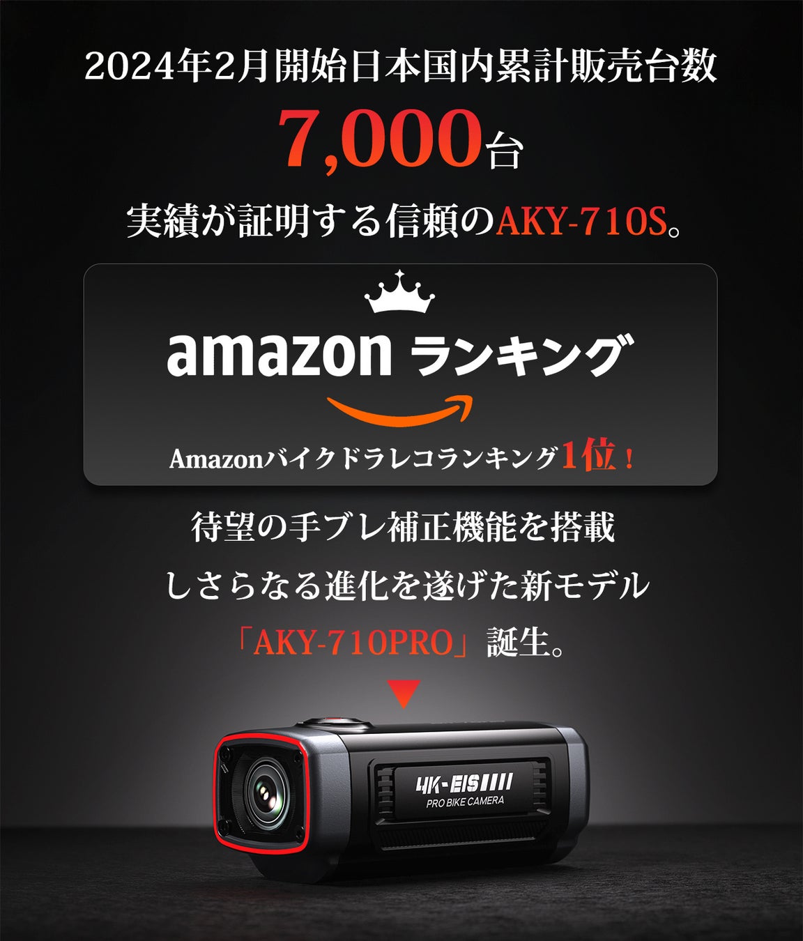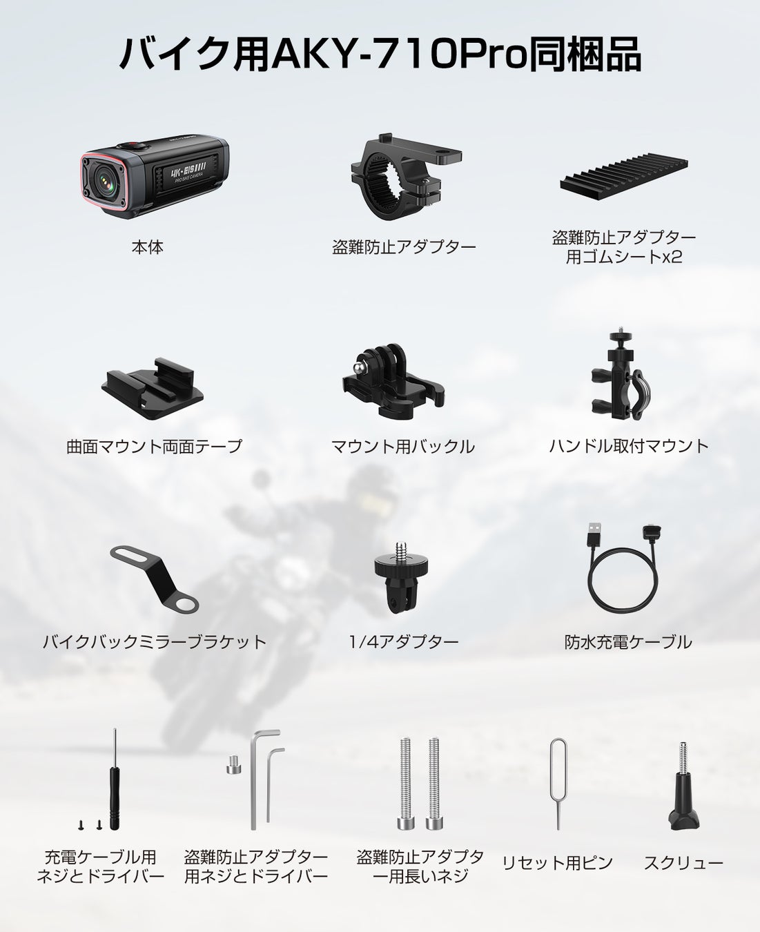 大好評のAKY-710Sシリーズが遂にパワーアップ。Amazonバイクドラレコランキング常時上位の信頼と実績から生まれた次世代モデルが登場。ユーザーの声を活かし、プロ級の手ブレ補正機能を搭載し、さらなる高みへ。