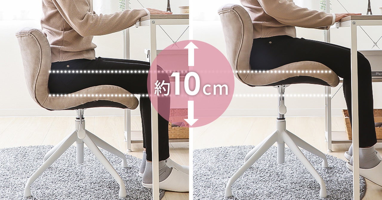 座面下にあるレバーで高さ調節ができます。座面高は最も低い位置で約42cm、最も高くすると約52cmになり、身長差があっても椅子をシェアできます。