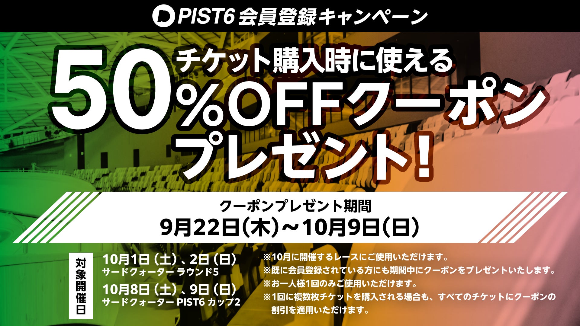 PIST6会員を対象に、上記対象レースのチケット購入時に使用できる「チケット50%クーポン」をプレゼント!新規にご登録いただいた方、既存会員の方ともにクーポンをプレゼントいたします。