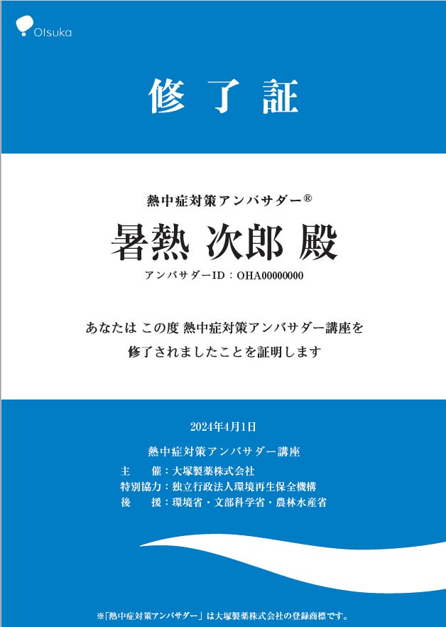 自治体、学校、企業等の組織・団体を対象に、正しい知識を持って熱中症対策を行うことを目的に設けられた制度で、大塚製薬の熱中症対策アンバサダー講座を修了することで、熱中症対策の啓発・普及活動をおこなう際に専門的な知識を習得できます。修了者は「熱中症対策アンバサダー®」として認定され、周囲の人々に対する声かけの輪を広げる活動等に役立てることができます。