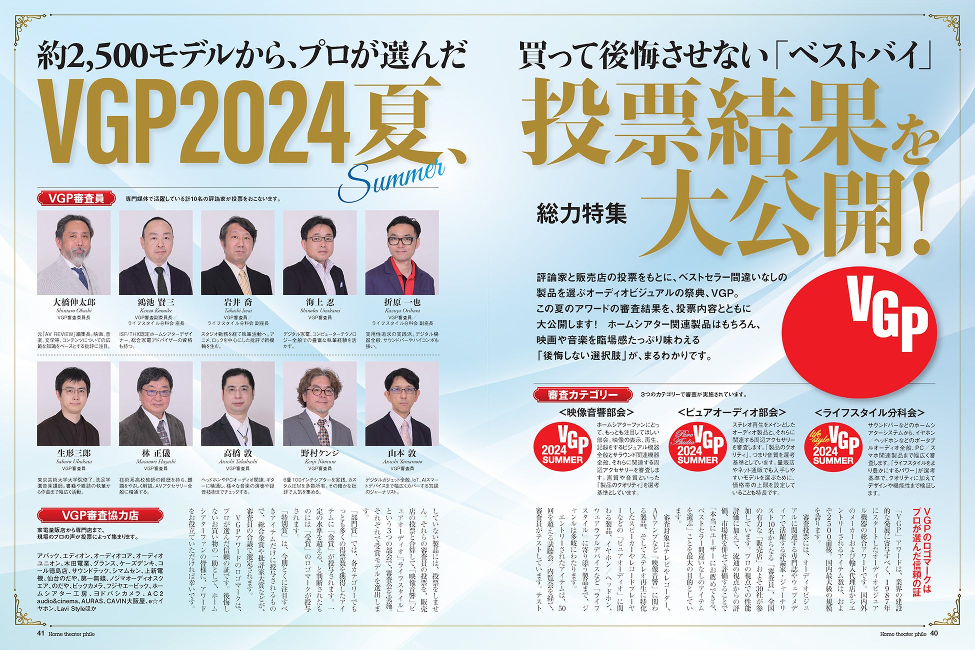 オーディオビジュアル機器の魅力を熟知した評論家と全国の有力販売店、そんなプロたちの厳正なる審査によって、ベストセラー間違いなしの製品が選定されるオーディオビジュアルの祭典「VGP」。2024年夏のアワードの審査結果を、プロの投票内容とともに大公開。ホームシアターやオーディオビジュアル関連製品のオススメは、これで決まりです。