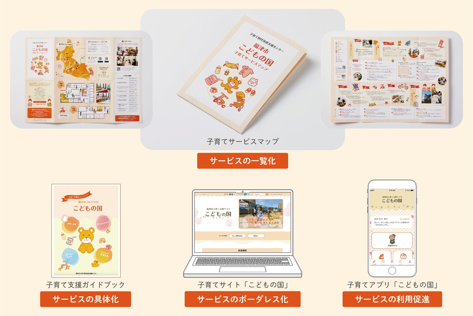 福岡県福津市は、市民や大学との共創により「福津市こどもの国」として市民にわかりやすい子育て行政サービスを目指している。本プロジェクトでは、多忙で不安の多い保護者の視点から既存のサービスの届け方を見直し、再構築した。具体的には、複雑な子育てサービスの全体像がわかる「子育てサービスマップ」、詳細がわかる「子育て支援ガイドブック」、市の「ウェブサイト」と「子育て支援アプリ」の相互利用性の向上と、保護者の心理面に寄り添うグラフィックデザインを行なったものである。