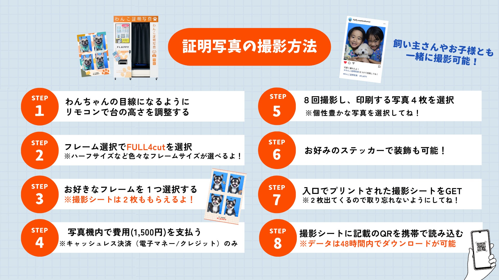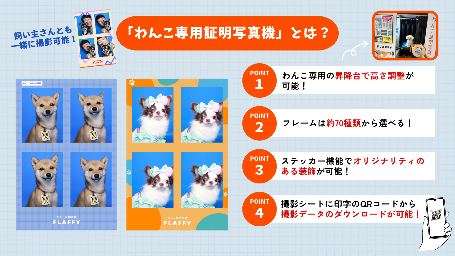 「わんこ専用証明写真機」は、FLAFFYが独自で企画・展開するわんこ専用のセルフ撮影機です。人間用の証明写真機と同じ操作感で、愛犬の“今”を楽しく、高クオリティで気軽に撮影できます。約70種類以上から選べるフレームや、オリジナリティある装飾が可能なステッカー機能、QRコードによる撮影データのダウンロードなど、思い出づくりをサポートする工夫が詰まった新しい体験型コンテンツです。