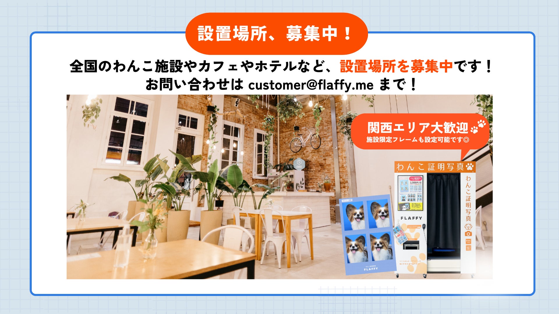 全国のわんこ施設・カフェ・ホテルで『わんこ専用証明写真機』の設置場所を募集中!特に関西エリアは未出店のため大歓迎です。今後は全国に常設スポットを広げていきます。