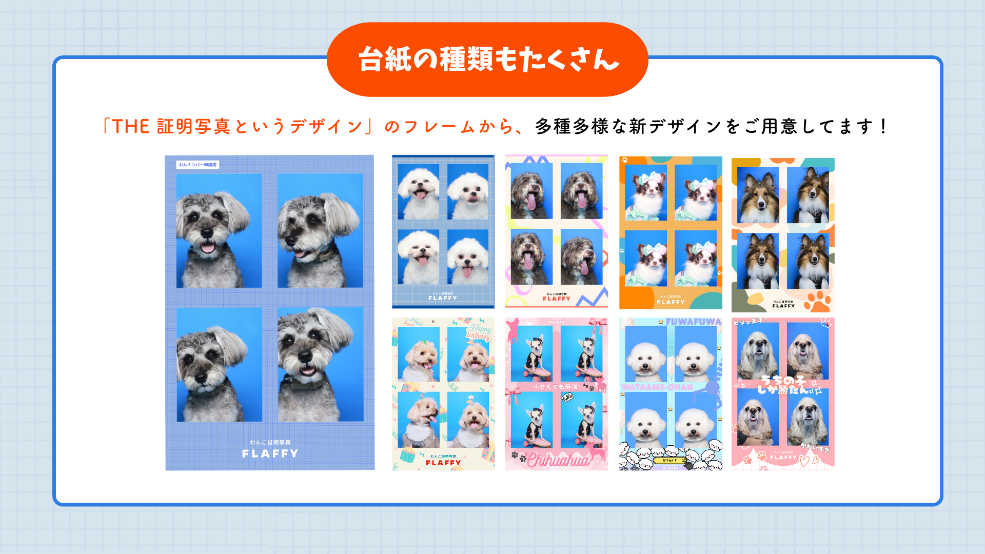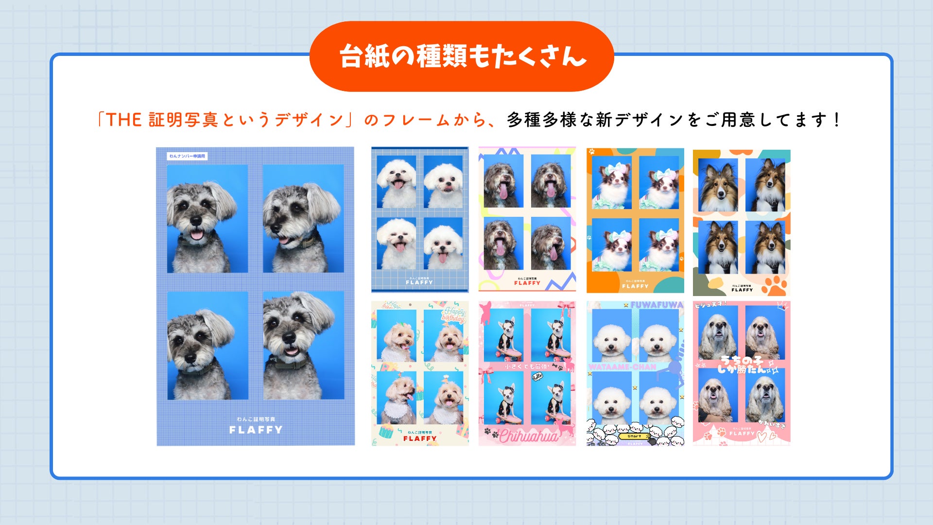 フレームの種類は約70種類以上に増加し、選ぶ楽しみがさらに広がりました。また新機能として「ステッカー装飾機能」が追加され、撮影した写真にスタンプを自由に加えて、世界に一つだけのオリジナル証明写真を作成いただけます。定番人気のTHE証明写真風「わんナンバー」フレームをはじめ、うちの子推し活フレームやうちの子バースデーフレーム、犬種別や季節限定デザインなど盛りだくさん。毎回、選ぶ楽しみも増えました!さらに従来のフルサイズ以外にハーフサイズなども加わり、より多彩な仕上がりをお楽しみいただけます。愛犬との大切な思い出を、もっと自由に、もっと楽しく残してみてはいかがでしょうか。