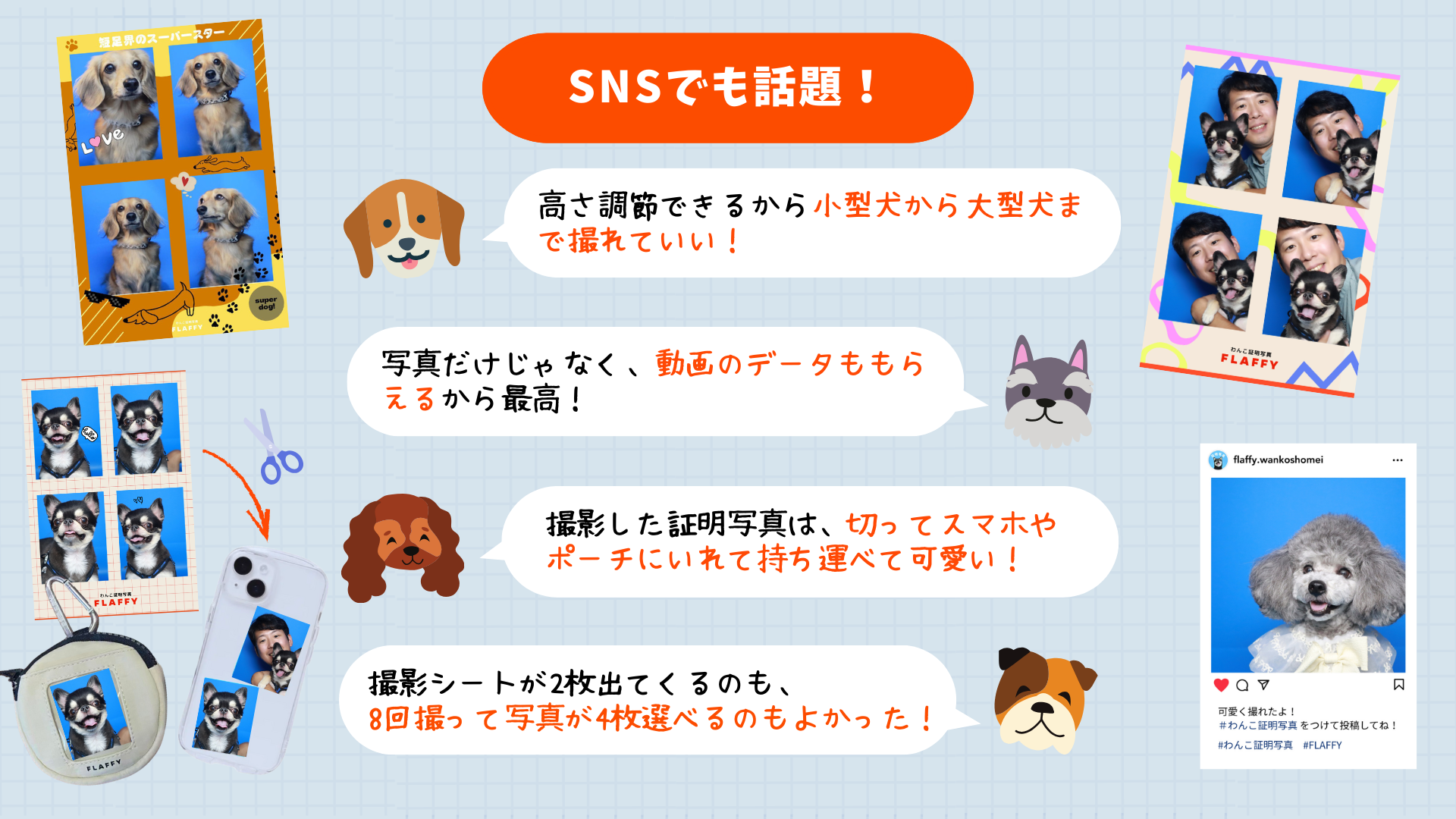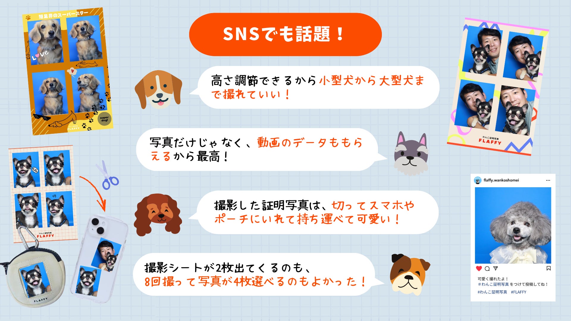 これまでに「わんこ証明写真」をご利用いただいたお客様からは、「うちの子の可愛い瞬間が残せて嬉しい!」「家族写真にぴったり」「愛犬とのステキな思い出が残せた」といった嬉しいお声が多数寄せられており、SNS上でも「#わんこ証明写真」の投稿が話題となりました。 印刷した証明写真は、愛犬用グッズに貼ったり、カットしてスマホケースへ入れたりと、楽しみ方が広がっている点も好評です。
