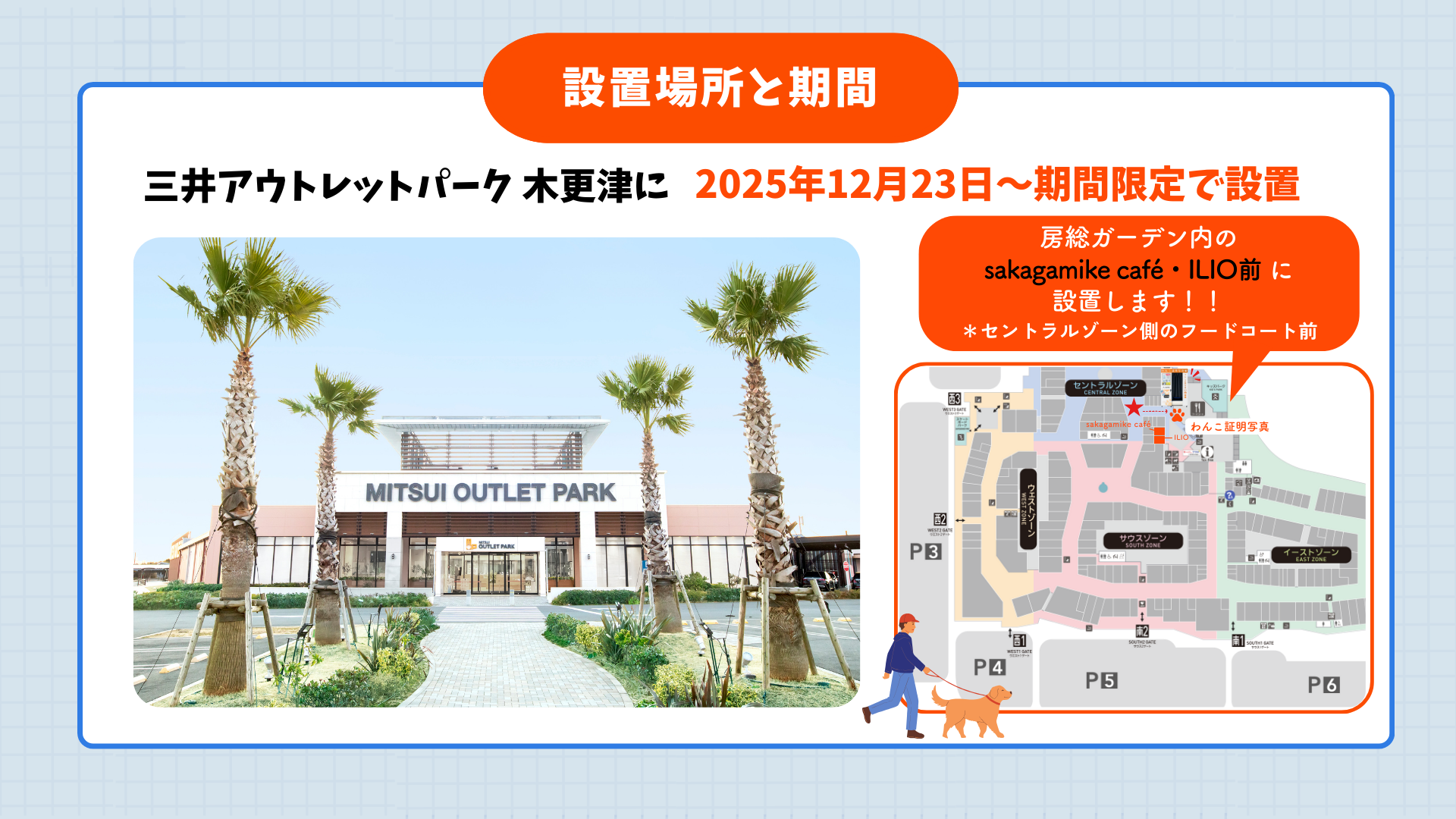 今回、第4弾の設置場所に決定したのは千葉県木更津市の金田東にある、国内最大級のアウトレットモール『三井アウトレットパーク 木更津』。幅広いブランドと多彩な飲食店舗が集まることに加え、わんちゃんフレンドリーな店舗も多く、ドッグランもあることから、わんちゃんとの外出先としても人気のこの施設にて「わんこ証明写真」をご体験いただけます。毎シーズン異なる季節限定フレームもご用意し、いつ何度来てもお楽しみいただけます!