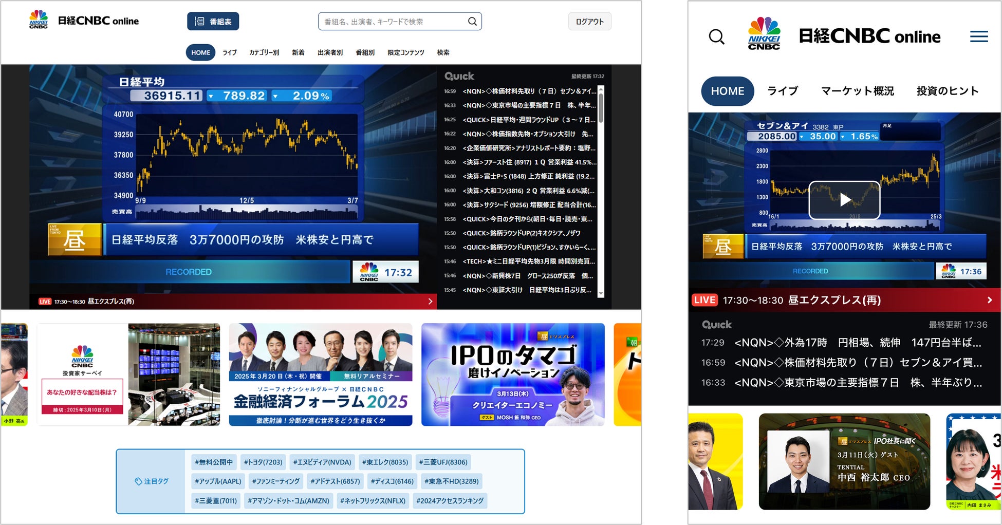 東京市場の動きを実況中継、海外市場の動きも速報し、多彩なゲストが今後のマーケットの動きを解説します。注目上場企業のトップやIPO企業の経営者が連日生出演するほか、日銀やFOMCなどの重要会見もライブ配信しています。