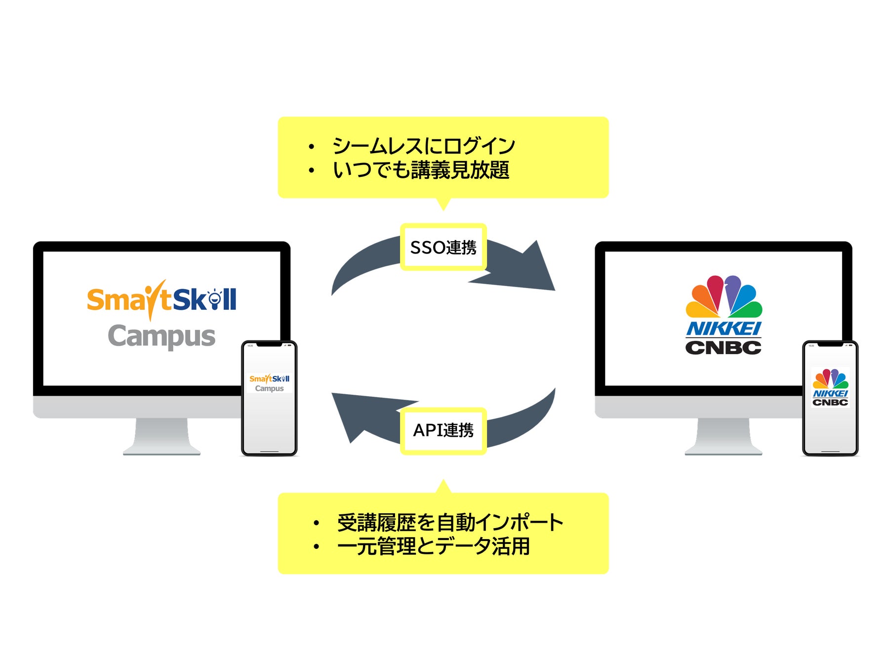 SmartSkill Campusと「日経CNBC online」は、SSO(シングルサインオン)および受講履歴を連携しました。この連携により以下のメリットを実現します。
