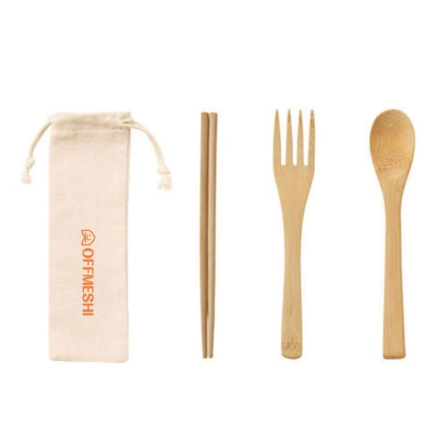 「オフめしカトラリーセット」には、竹素材で作られた箸、フォーク、スプーンが含まれ、オフめしのロゴ入り専用袋も付属しています。このセットは、持ち運びがしやすく、繰り返し使用可能なため、使い捨てカトラリーの代替品として最適です。