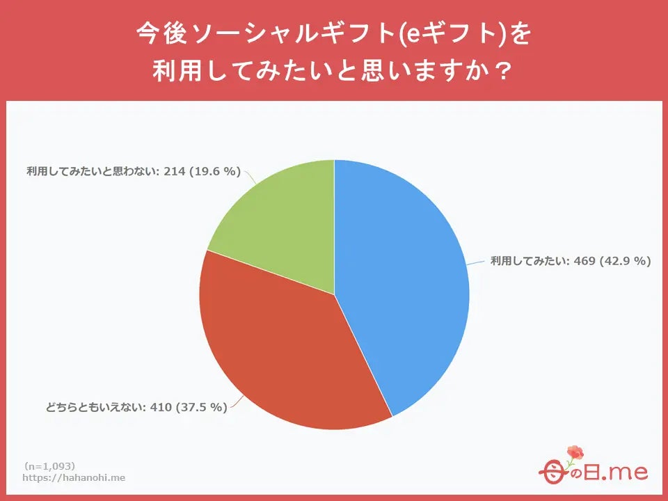 ソーシャルギフト(eギフト)を「利用してみたい」人が42.9%と関心度が高い事が分かる結果となり、ソーシャルギフト(eギフト)に対して前向きな考えを持っている人が多いことがわかりました。前述のアンケートの回答で「ソーシャルギフトをまだ使った事がない」と答えた人数が524人であった事を考慮すると、サービスを認知していても利用経験が無い人は、ソーシャルギフト(eギフト)の利用に前向きな人の割合は非常に高い可能性があり、こういった面で見ても、今後市場の高い成長性が期待できると想定されます。