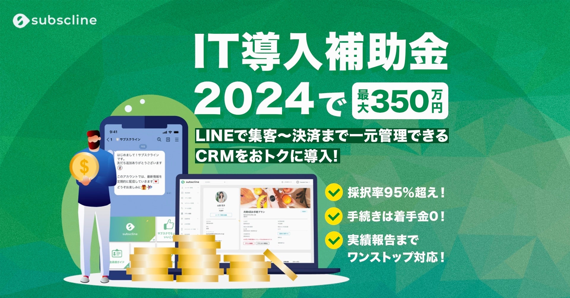 LINEの集客から決済まで一元管理が可能なマーケティングCRMプラットフォーム『サブスクライン』が「IT導入補助金2024」の「インボイス枠(インボイス対応類型)」の補助対象ツールとして採択されました。