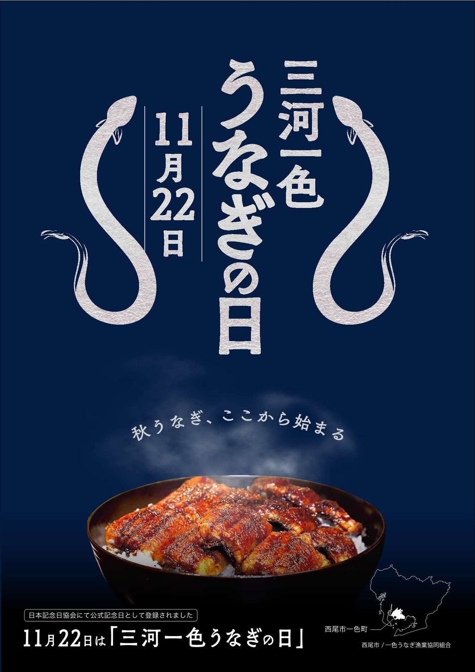 西尾市・市内生産者・卸売業者・鰻取扱店舗が一体となって、『三河一色うなぎ』がワンランク上の付加価値を有するブランド鰻であることを全国の消費者・流通関係者に共感してもらうため、地域ブランド『一色産うなぎ』の認定日でもある11月22日を、『三河一色うなぎの日』として日本記念日協会に登録しました。